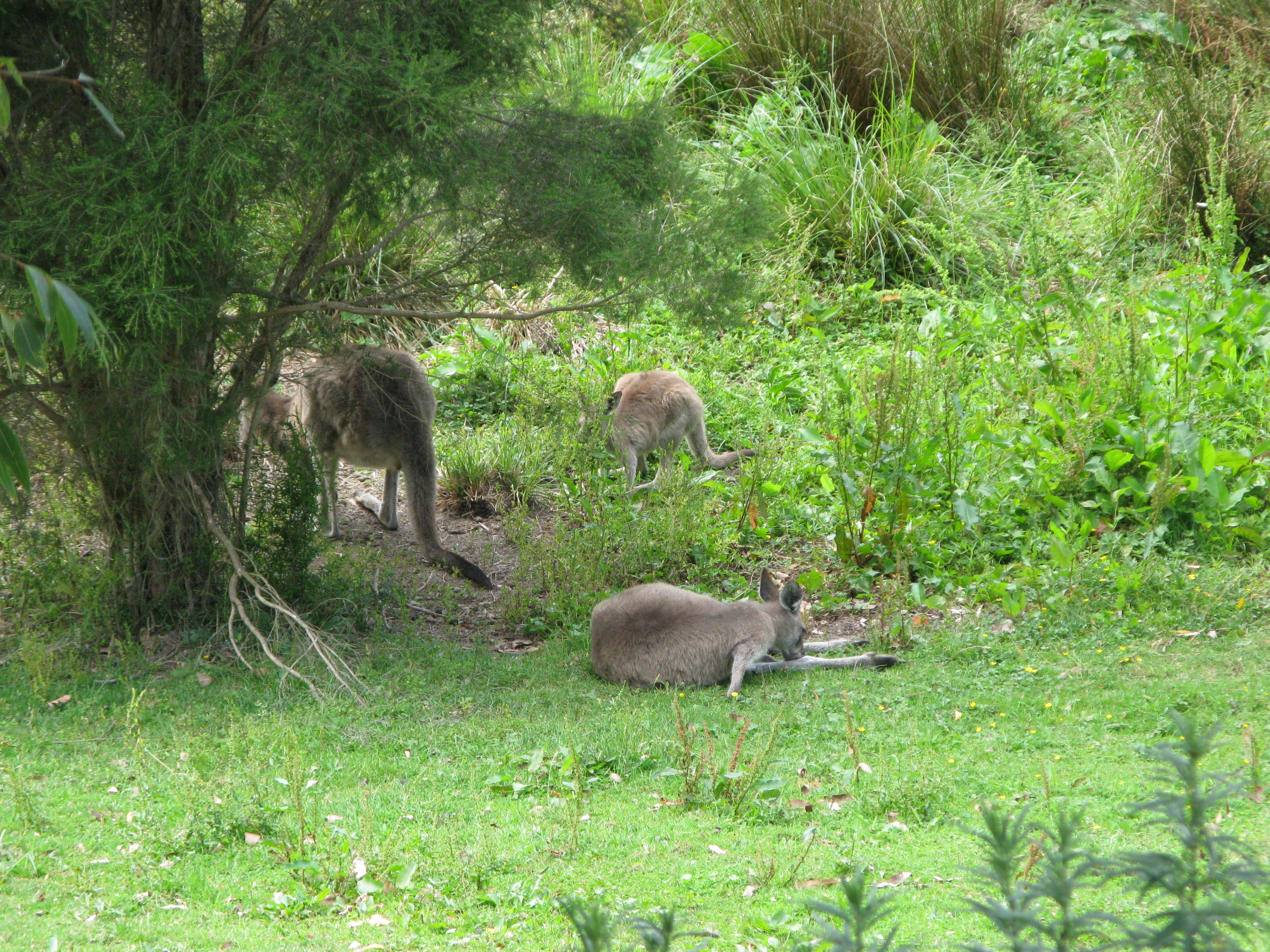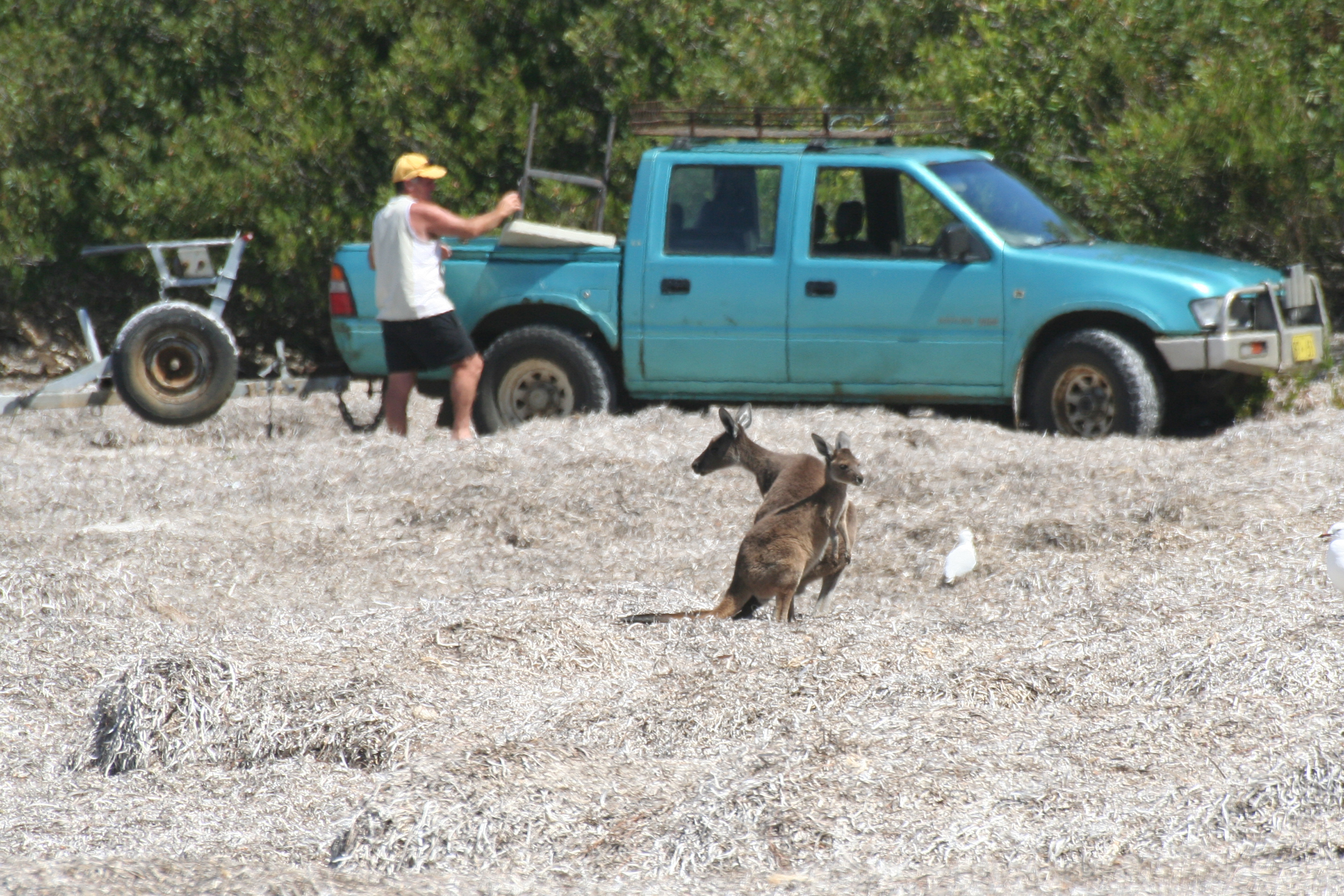 Nous décidons d’aller louer un petit bateau pour passer la journée sur le Mallacoota Inlet. Le point de location est au Gipsy Point juste au Nord de Mallacoota. En nous y rendant, nous croisons un troupeau de kangourous ! Il s’agit de nos premiers kangourous dans la nature ! (celui empaillé au National museum à Canberra ne compte pas !!). Nous sommes chanceux car il y a 2 femelles qui portent des Joeys (c’est le nom que donne les Australiens aux petits kangourous) dans leur poche ventrale, dont un qui sort sa tête !