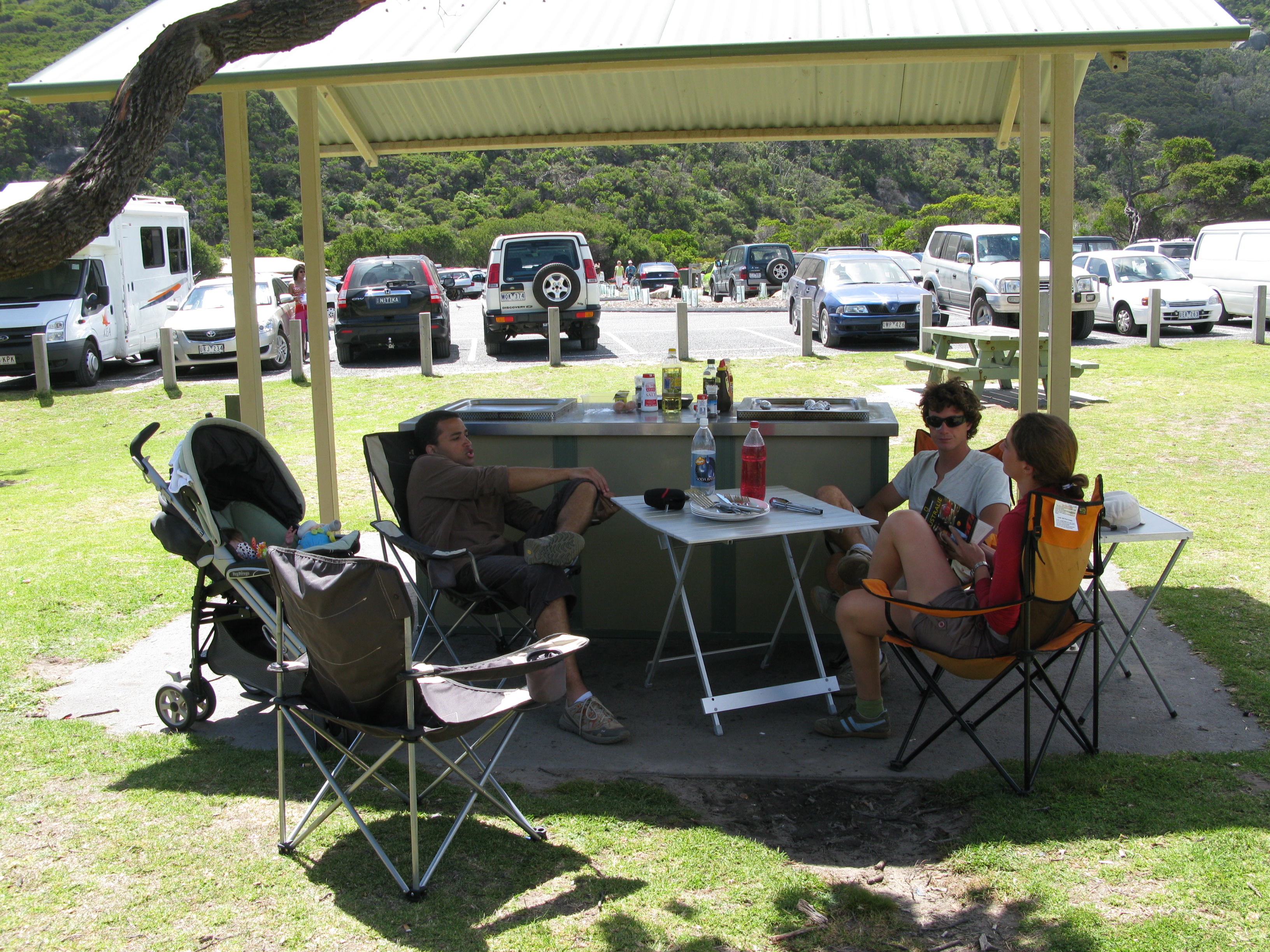 Nous voilà donc tous les 5 partis pour faire un bout de chemin ensemble pour les 3 prochains jours. Le soir, nous nous promenons à pied jusqu’au Bastion Point, et nous mangeons notre premier barbecue. Les Australiens sont férus de camping mais également de barbecue. Il est donc très facile de trouver des barbecues publics électriques ou au gaz. Ils peuvent également être au bois quand les risques d’incendie ne sont pas importants. Dans ces cas là, les rangers disposent des tas de bois à côté !
