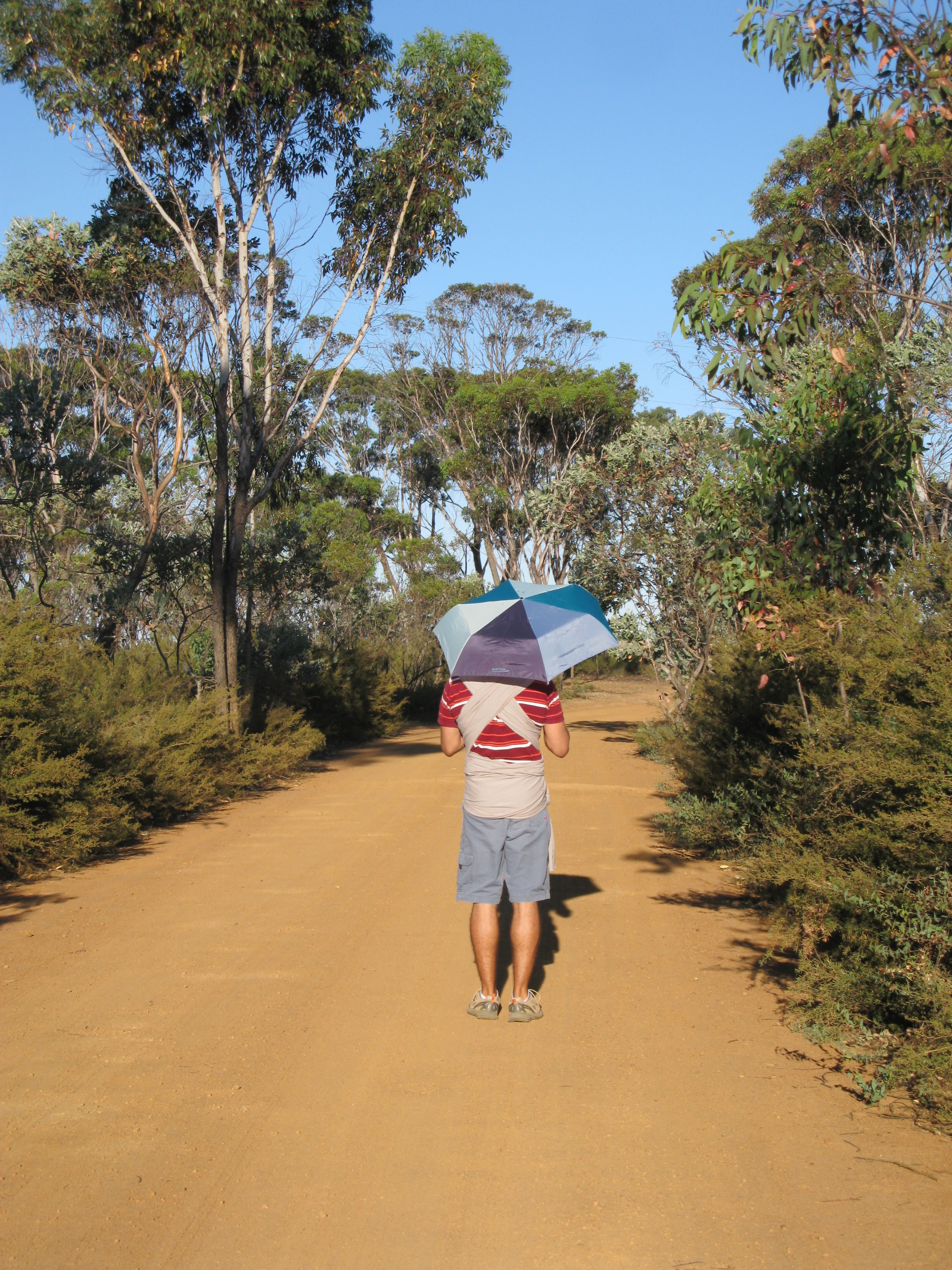 De Coral Bay à Exmouth, il y a environ 150 km désertiques : pas une station essence, pas une ferme, que des termites et des buissons. A mi-chemin entre les deux villes, nous croisons un jeune australien dont la voiture à un pneu crevé. Il n’a ni eau, ni roue de secours et il fait 37°C à l’ombre, un soleil de plomb sur une route quasiment déserte : en 80 km, nous n’avons croisé que 4 voitures. Bien entendu, il n’y a pas de réseau pour les téléphones portables. Voyant la situation, nous tentons de le convaincre de nous accompagner à Exmouth afin qu’il puisse passer un coup de fil et surtout, pour qu’il ne reste pas en plein soleil. Nos arguments ne sont pas convaincants puisqu’il choisit d’attendre le passage d’une voiture dans l’autre sens pour continuer sa route vers Coral Bay. Nous lui laissons de l’eau et continuons notre route. Pour la petite histoire, quand nous sommes repassés quelques jours plus tard, sa voiture était toujours là … mais pas le conducteur !