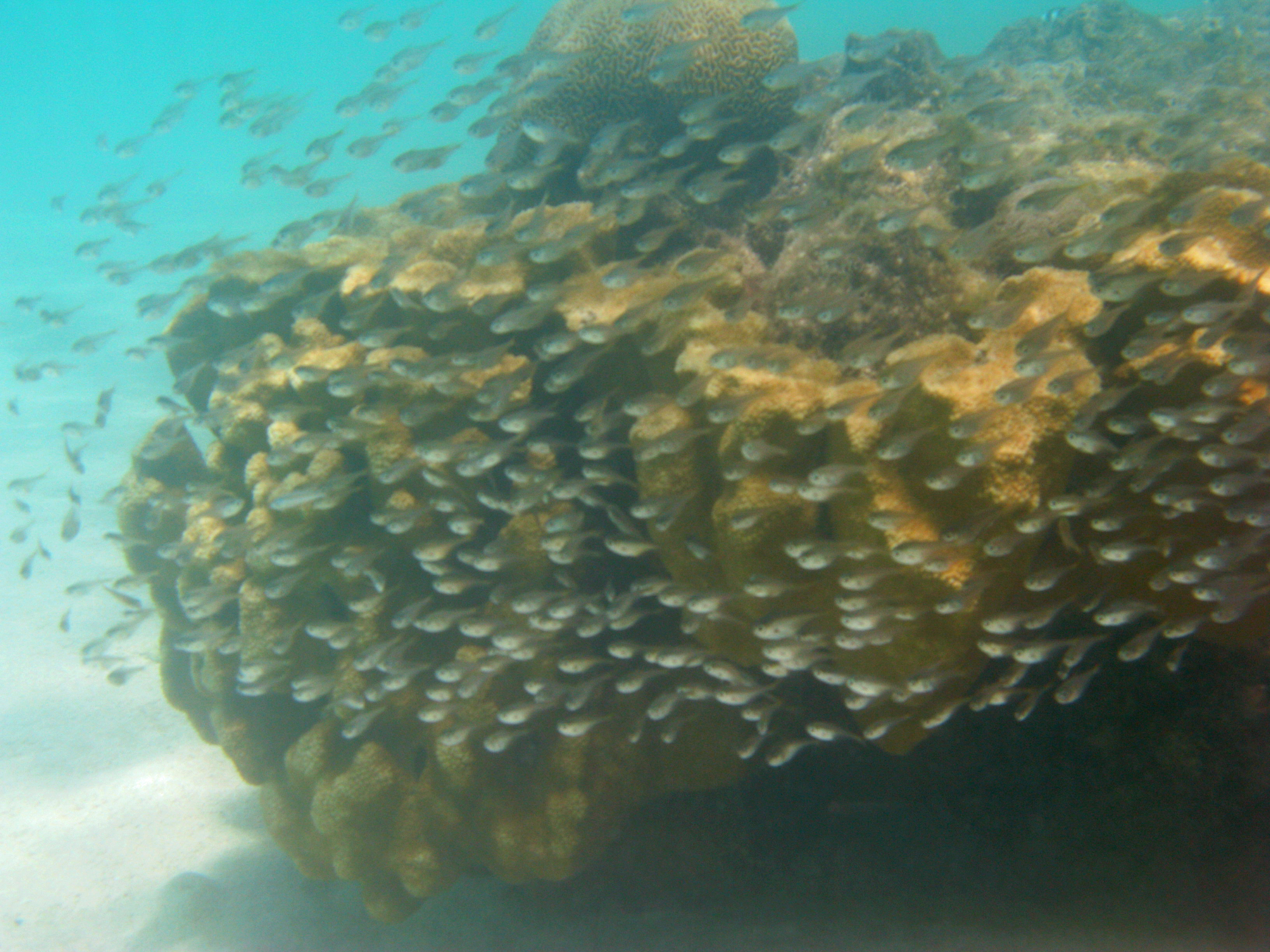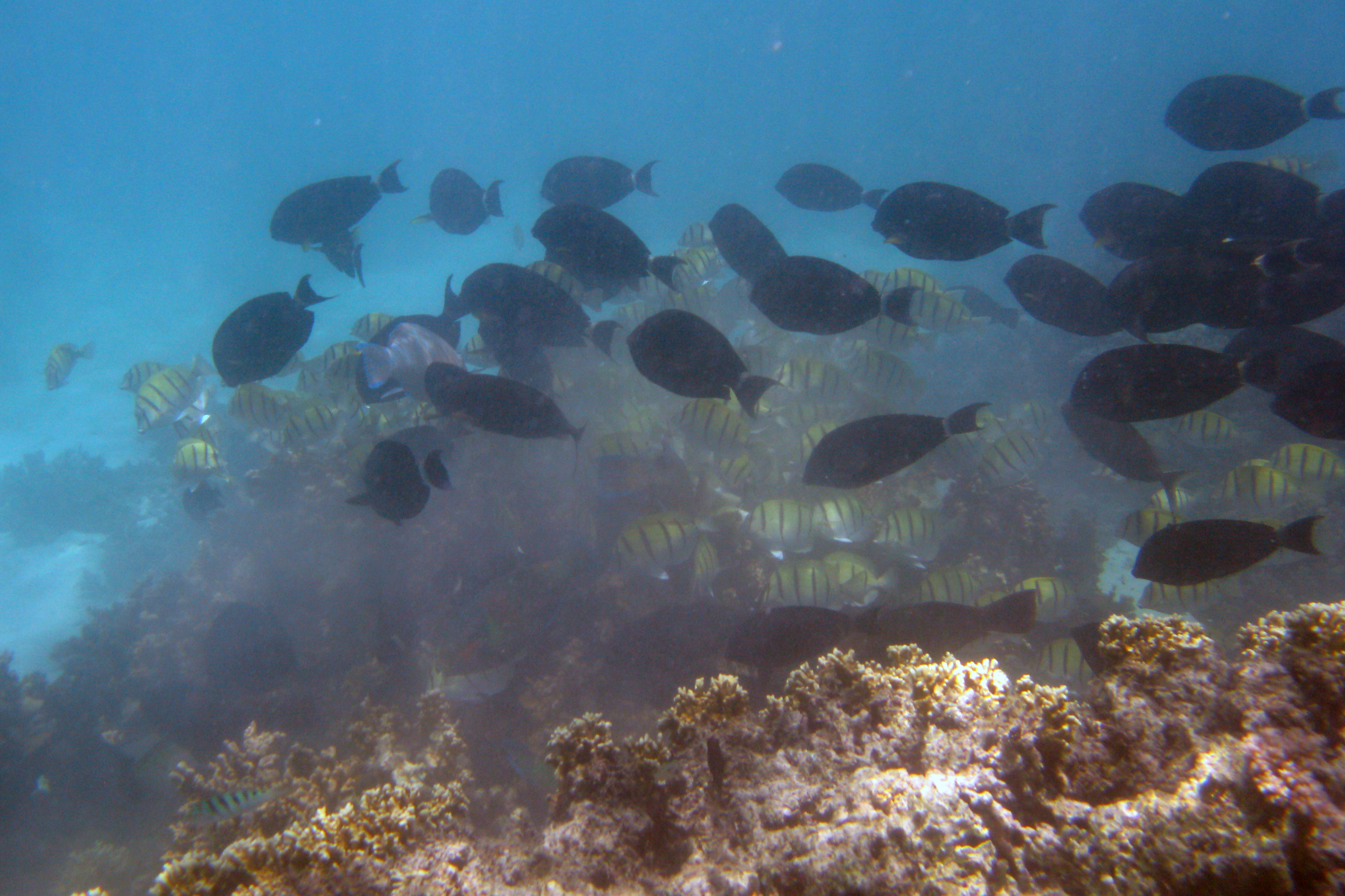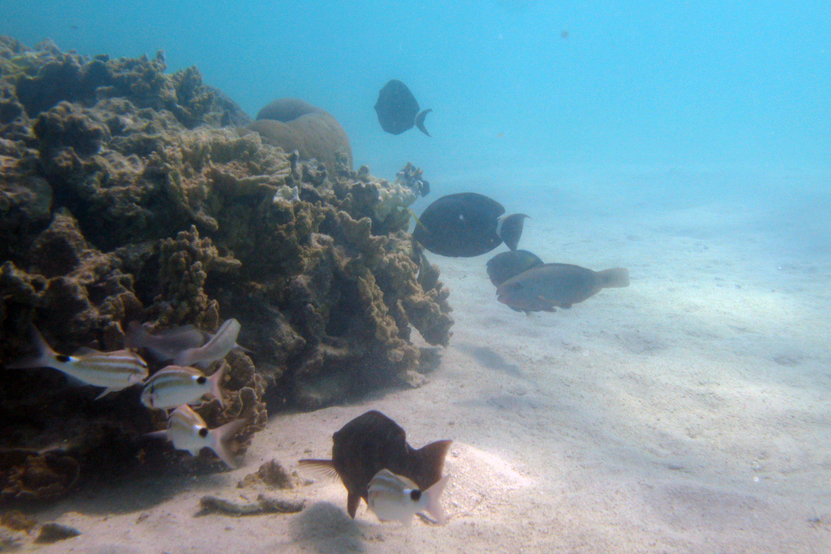 La première plongée à lieu au « Porites » où elle a pu rencontrer de nombreux poissons. Mais le plus impressionnant d’entre tous fût un poisson lune de plus d’1m de diamètre (un « batfish » en anglais). Ensuite ? Séance de snorkelling en pleine mer pour apercevoir plusieurs raies Manta. Nager tout près d’elles est vraiment une expérience unique !!