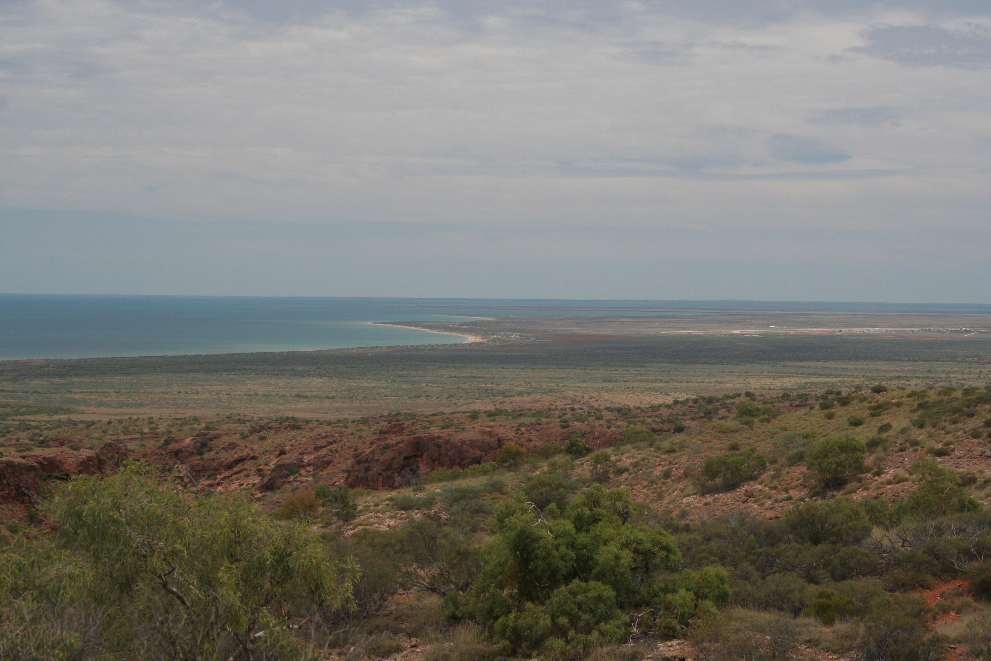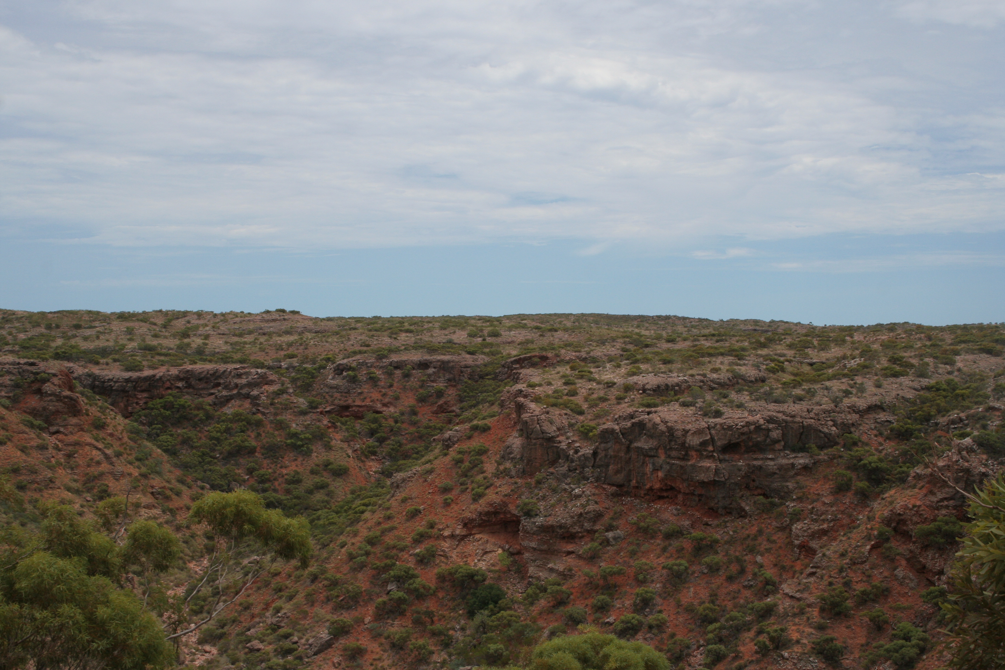 Ça y est, nous entamons notre descente vers le sud et Perth. Cependant, entre Exmouth et Coral Bay, nous nous arrêtons au Charles Knive Canyon. Après une petite route goudronnée, nous voilà de nouveau sur une « gravel road » ! Nous grimpons malgré tout et, au sommet d’une crête, 2 canyons s’offrent à nous de part et d’autre de la route. Vous ajoutez la mer en arrière-plan et vous avez à nouveau un site magnifique devant vous ! Nous y passons la matinée à faire des photos et nous mangeons sur place.