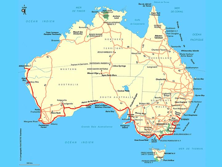La carte ci-dessous représente le parcours que nous avons réalisé dans notre camping-car (10 000 km !). Notre itinéraire avait pour objectif d’éviter la côte est très touristique et de profiter de la côte ouest plus sauvage, tout en n’omettant pas certains incontournables au sud-est. Arrivée prévue à Sydney, route jusqu’au Nord de la côte Ouest, puis retour en avion depuis Perth.