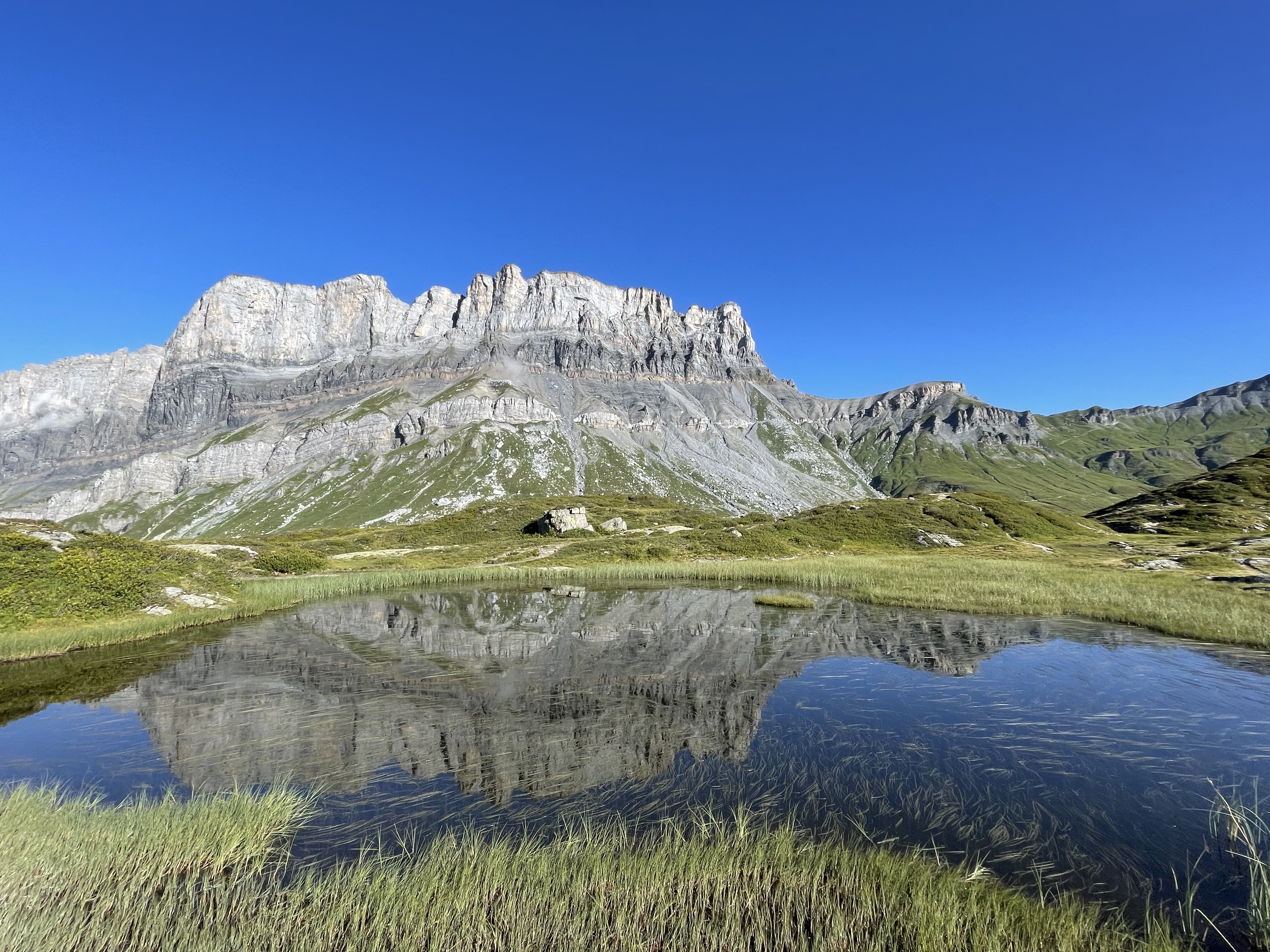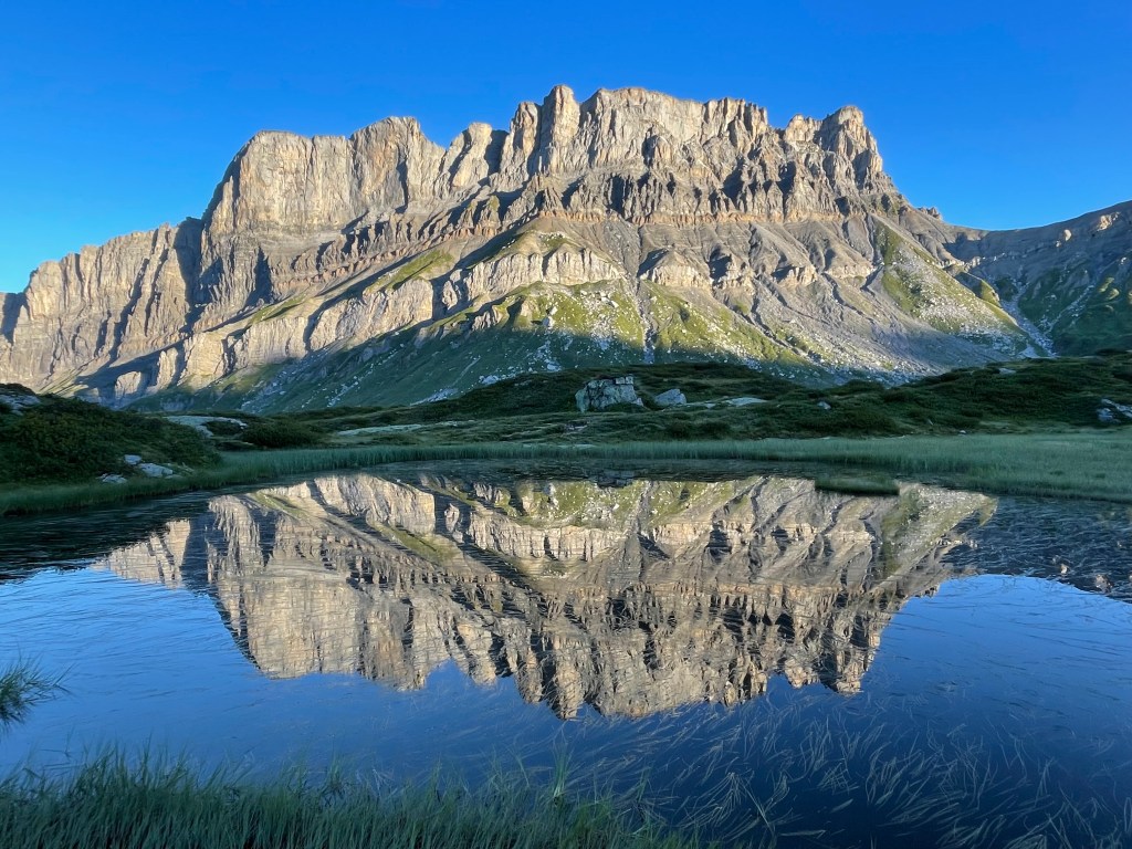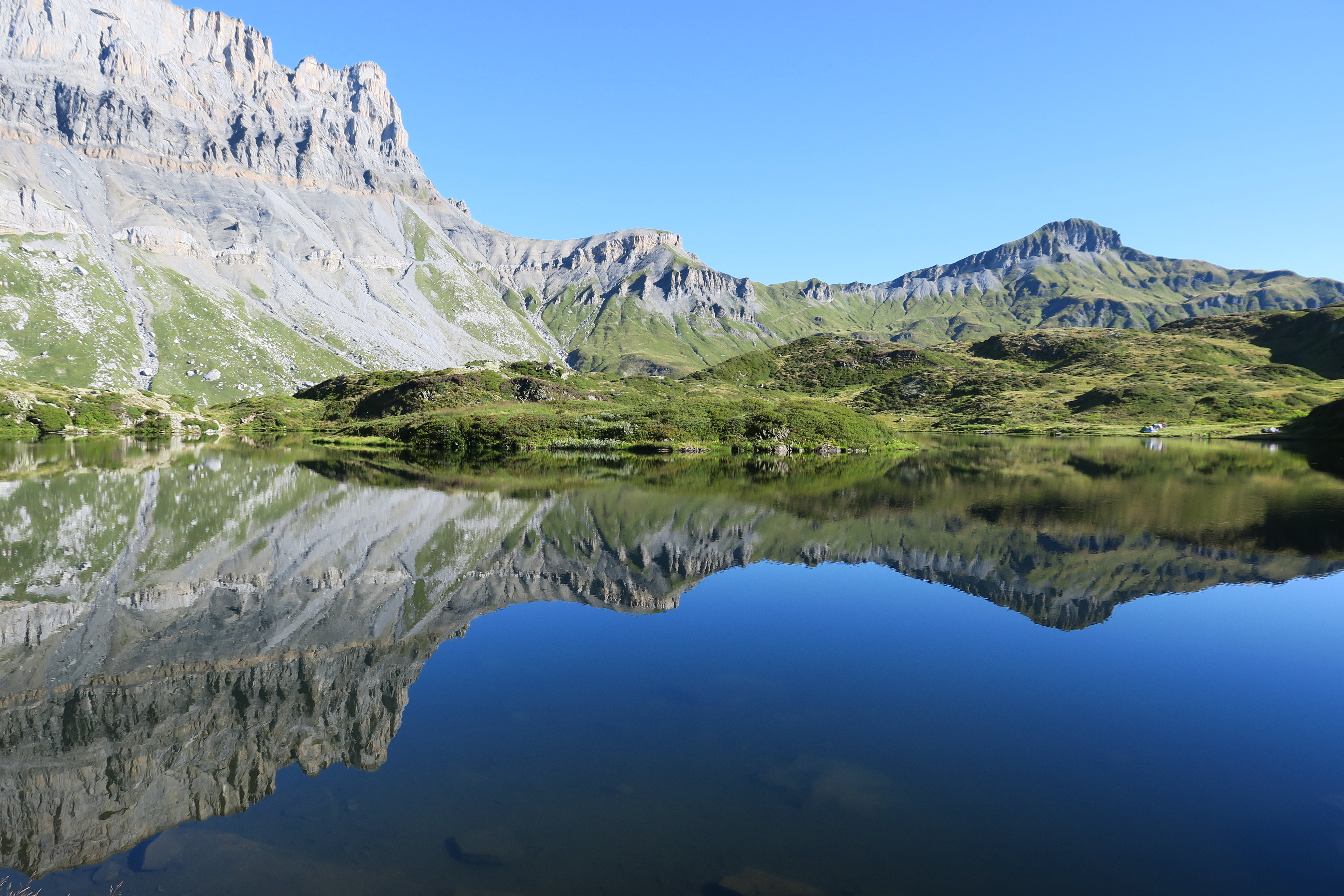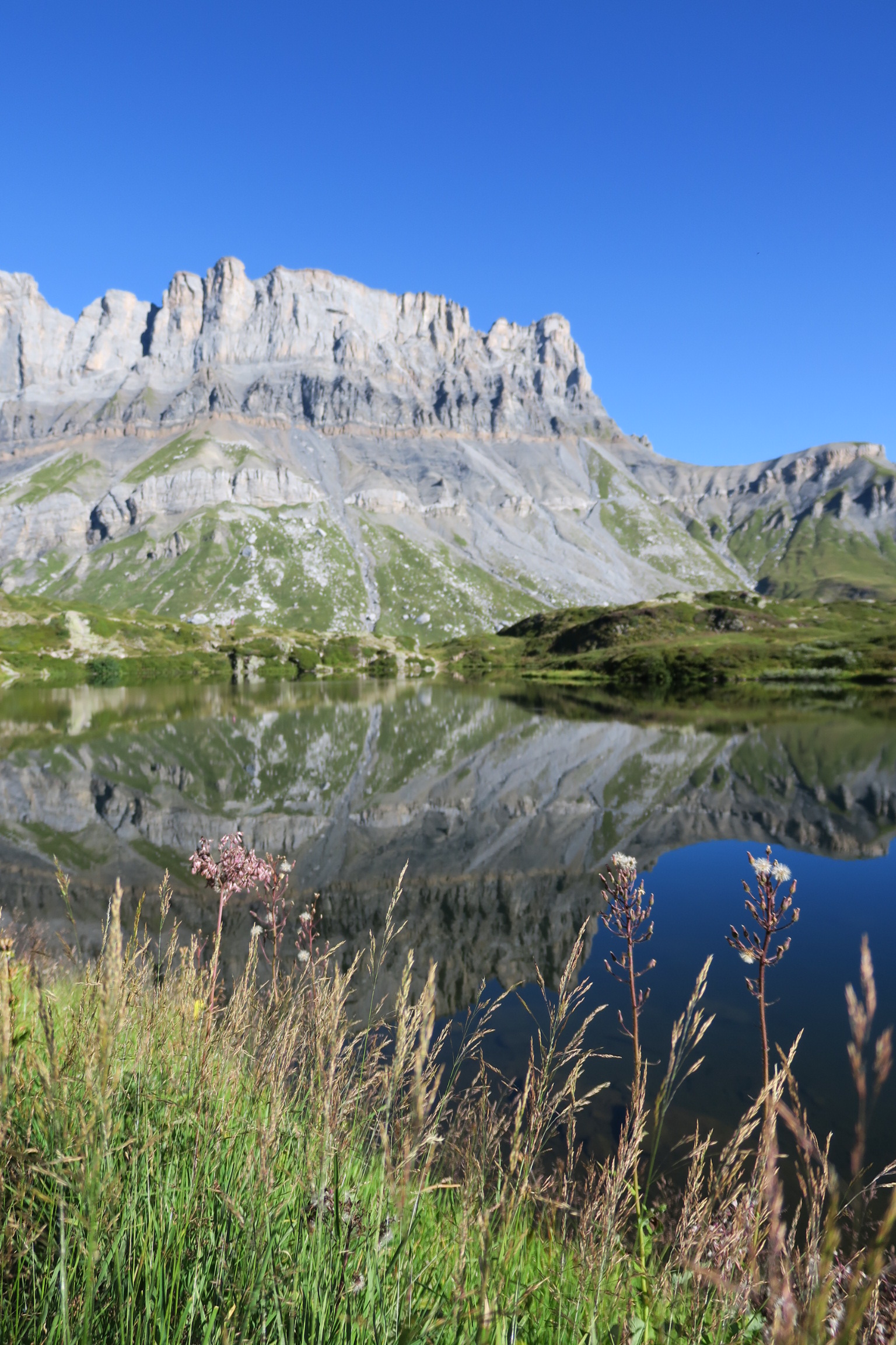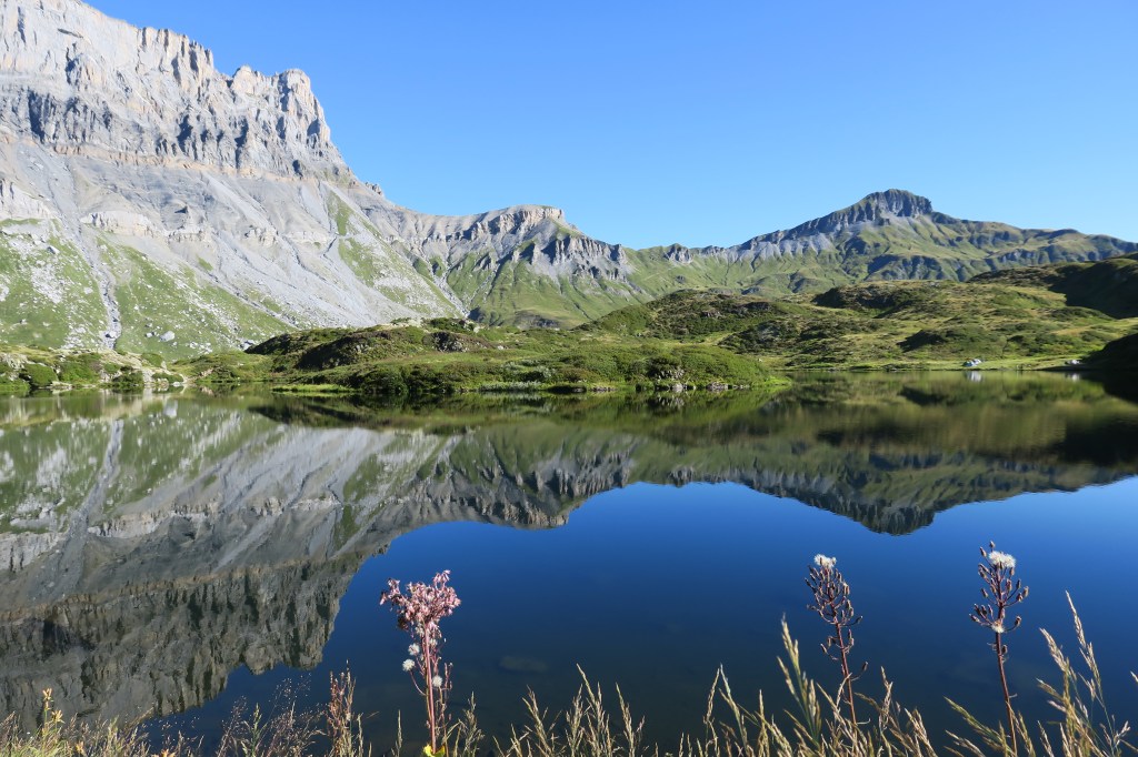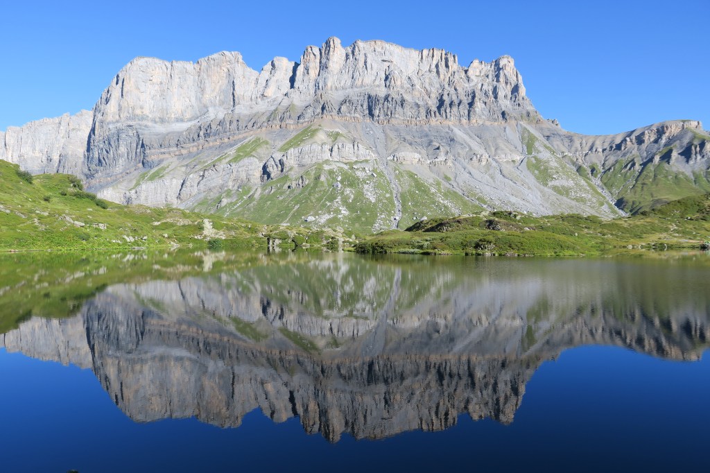 Après une bonne nuit de sommeil, nous nous réveillons à l’ombre, sous un ciel bleu magnifique. On attend alors patiemment que le soleil vienne nous réchauffer et éclaire la totalité du lac. Les premières heures du matin, sans vent nous offre un massif des Fiz se reflétant parfaitement dans le lac ! Tout simplement magnifique.