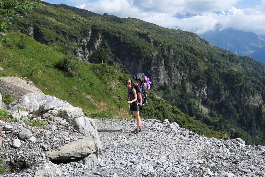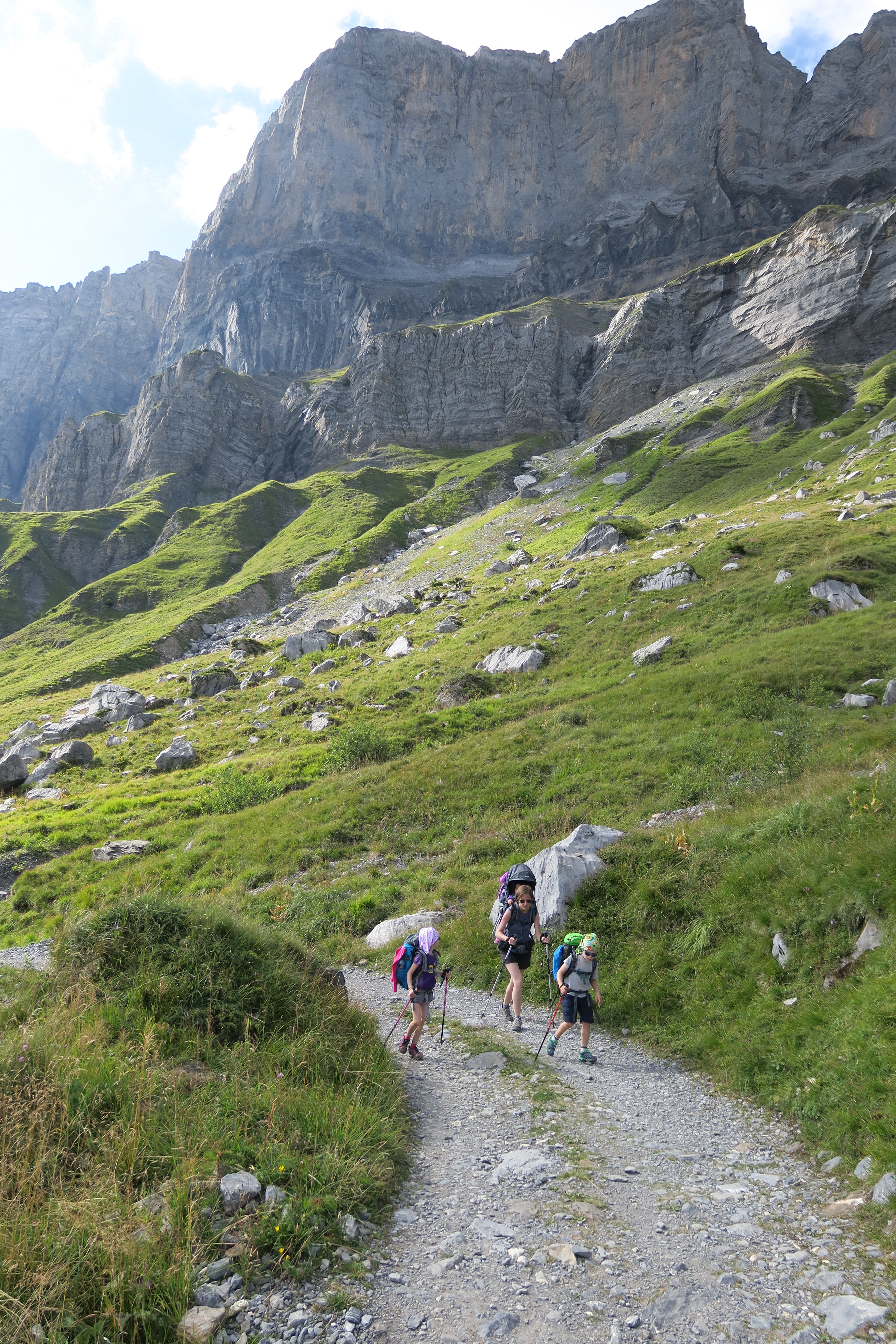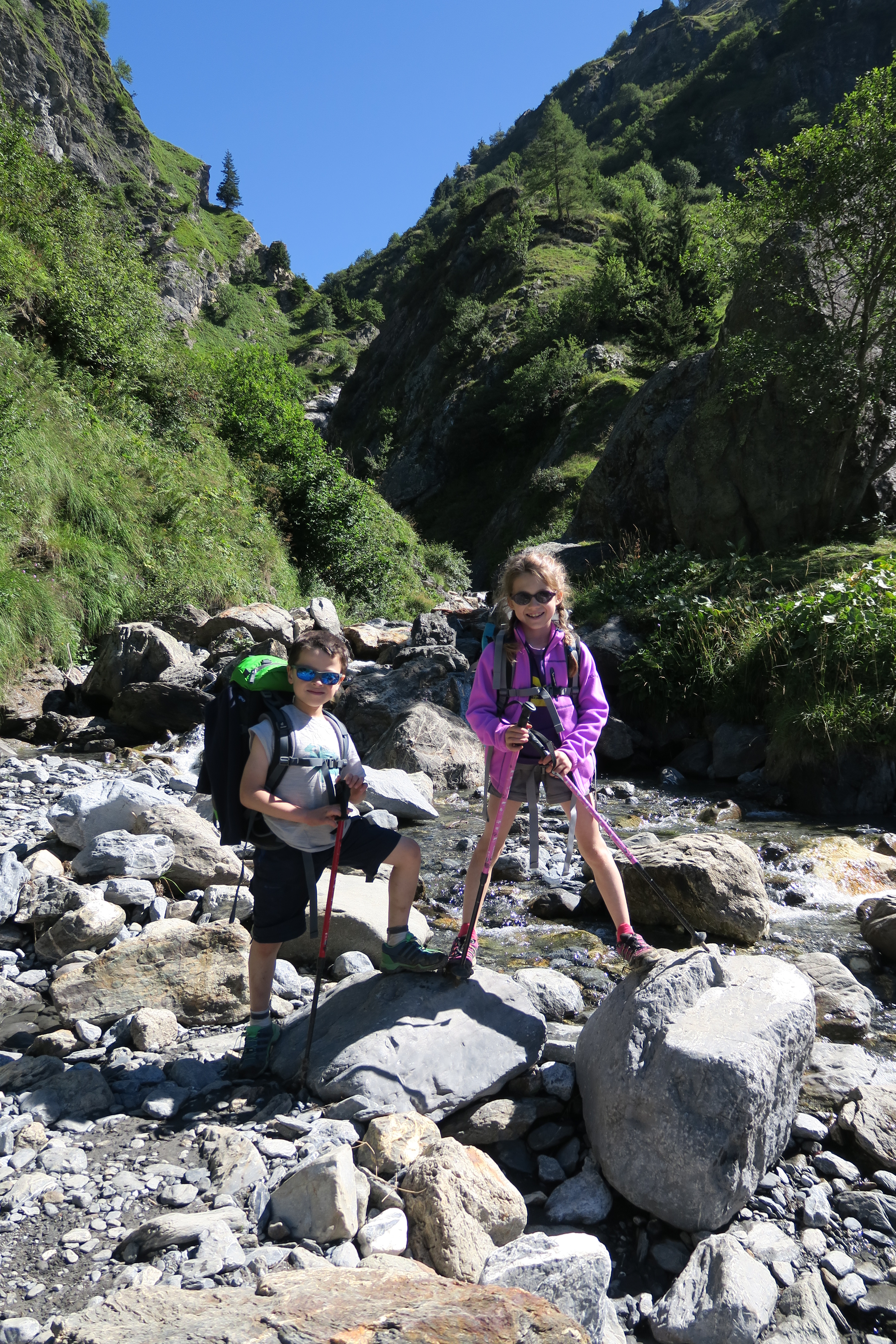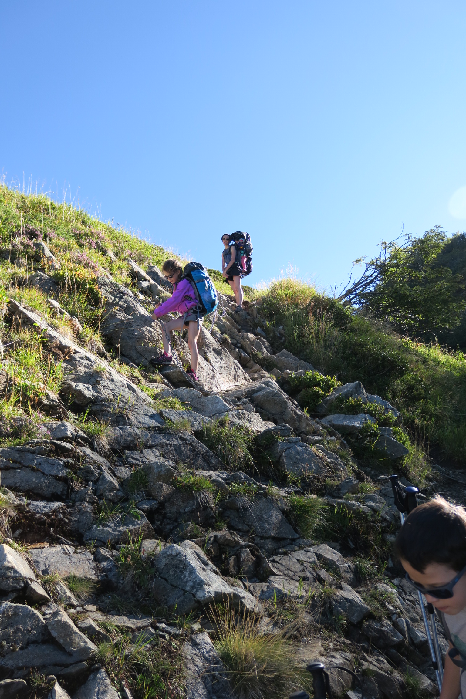 C’est parti pour la redescente où nous empruntons le passage de la Chorde. Celui-ci a une pente très soutenue et de nombreux passages sont très rocheux, avec des marches en ferrailles, des échelles et des câbles. Cela demande un peu de vigilance, particulièrement avec les sacs un peu chargés, mais aucune difficulté pour des enfants crapahuteurs.