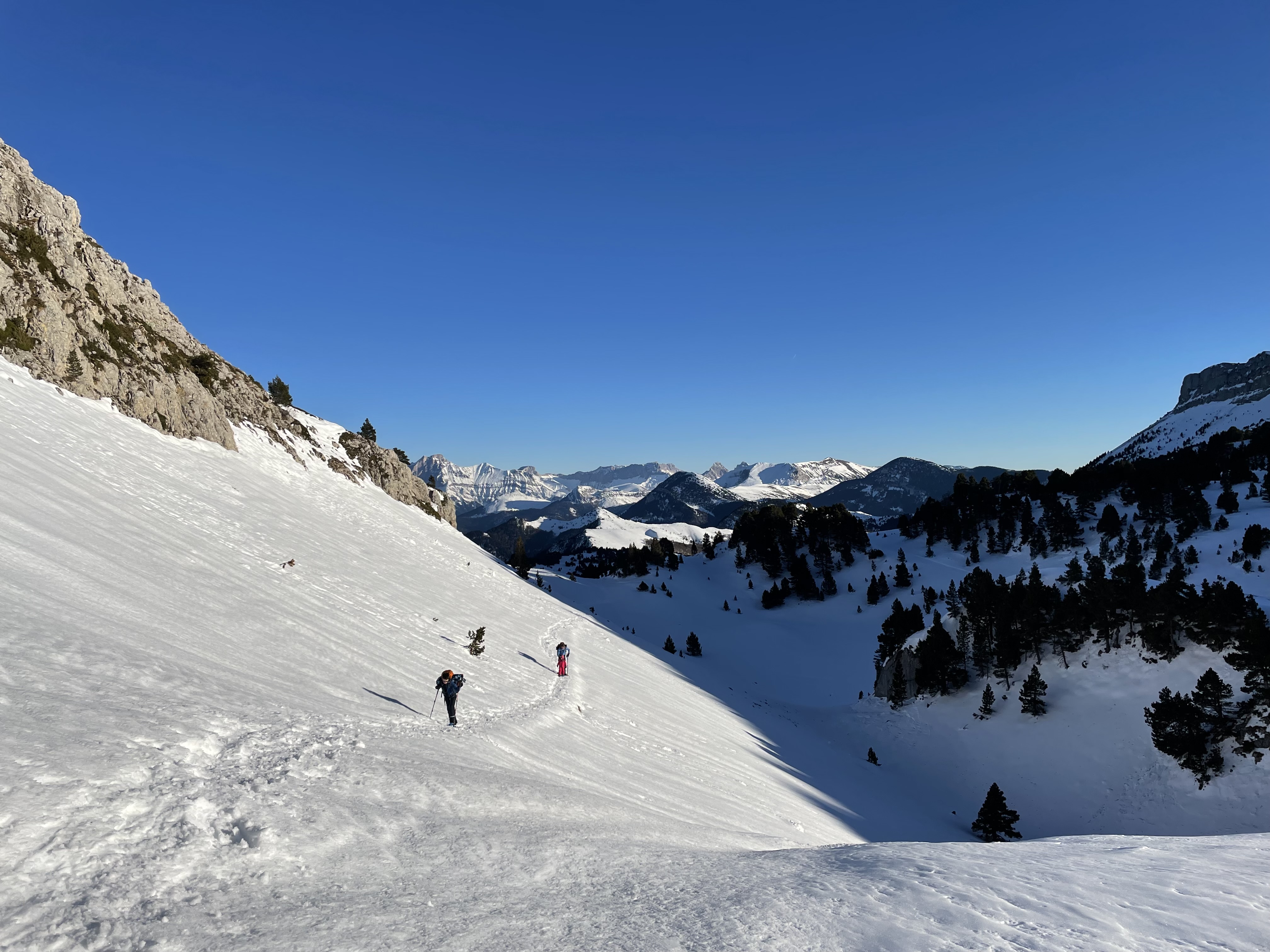 Nous nous sommes donc équipés de duvets plus chauds. Puis nous avons cherché un itinéraire sécurisé en hiver, le pas de l’Aiguille (au départ de Chichilianne) présentant des passages avalancheux, et des passages pouvant être verglacés en limite de précipice. Notre choix s’est porté sur une longue balade depuis le vallon de Combeau.