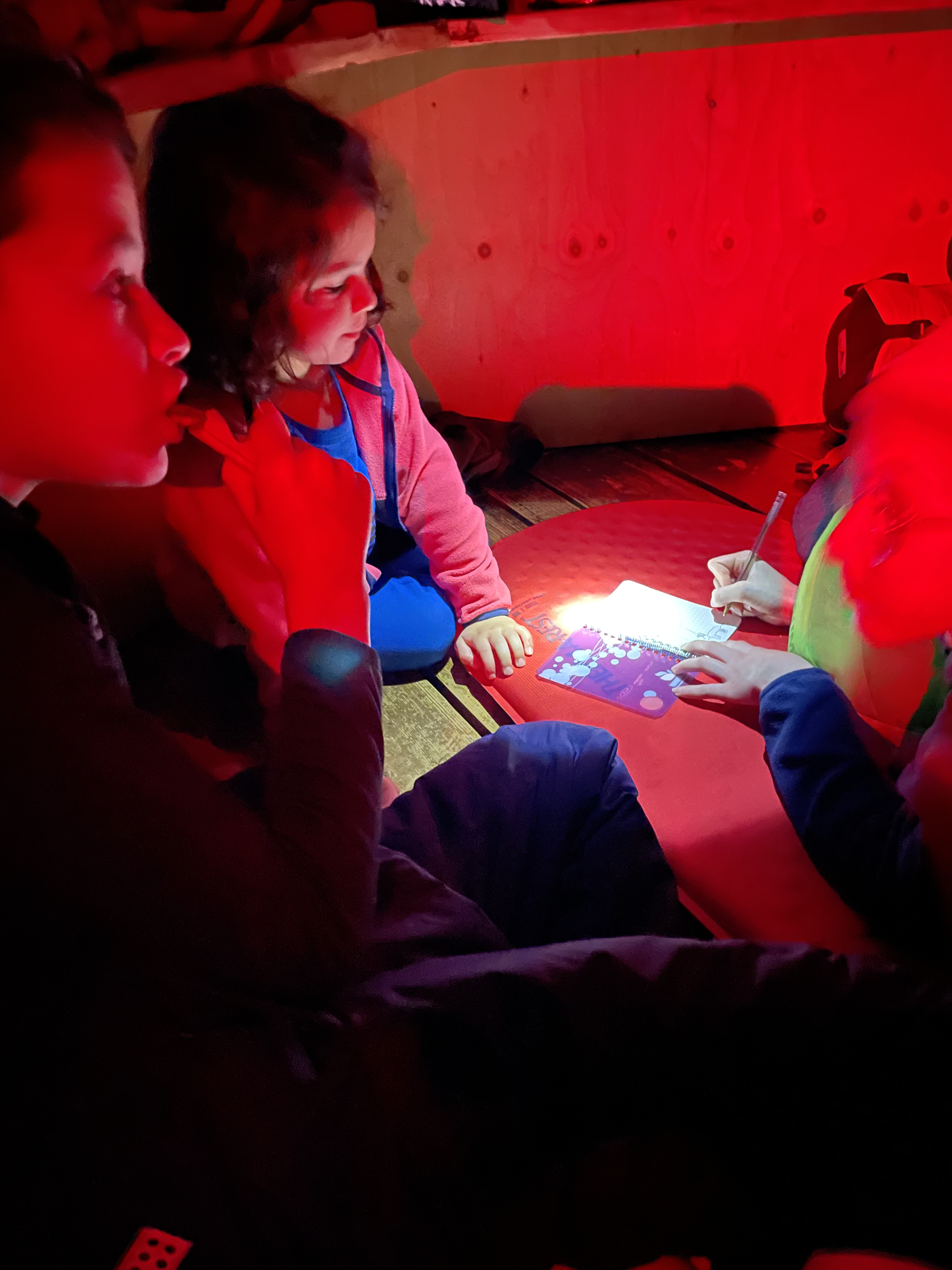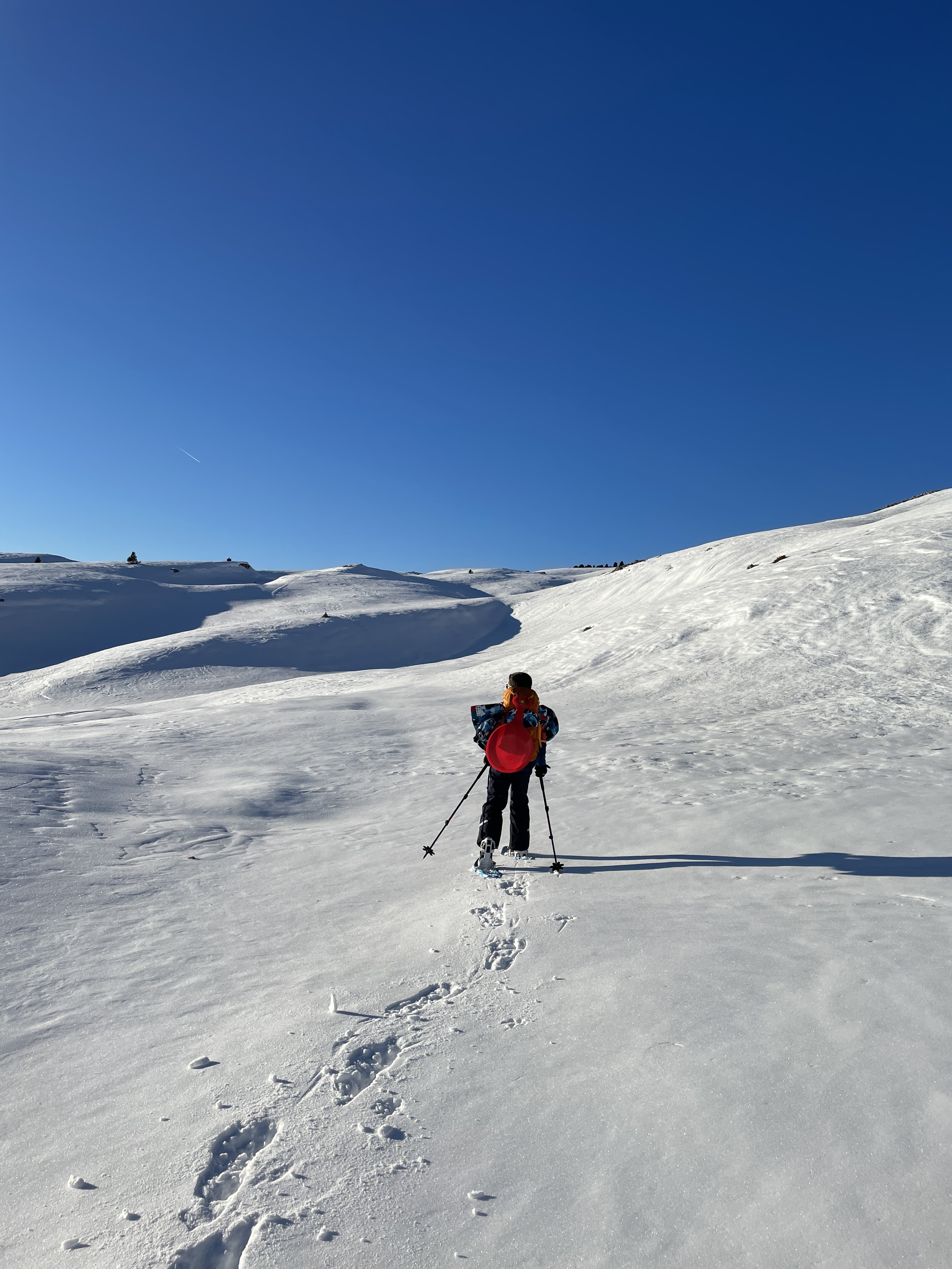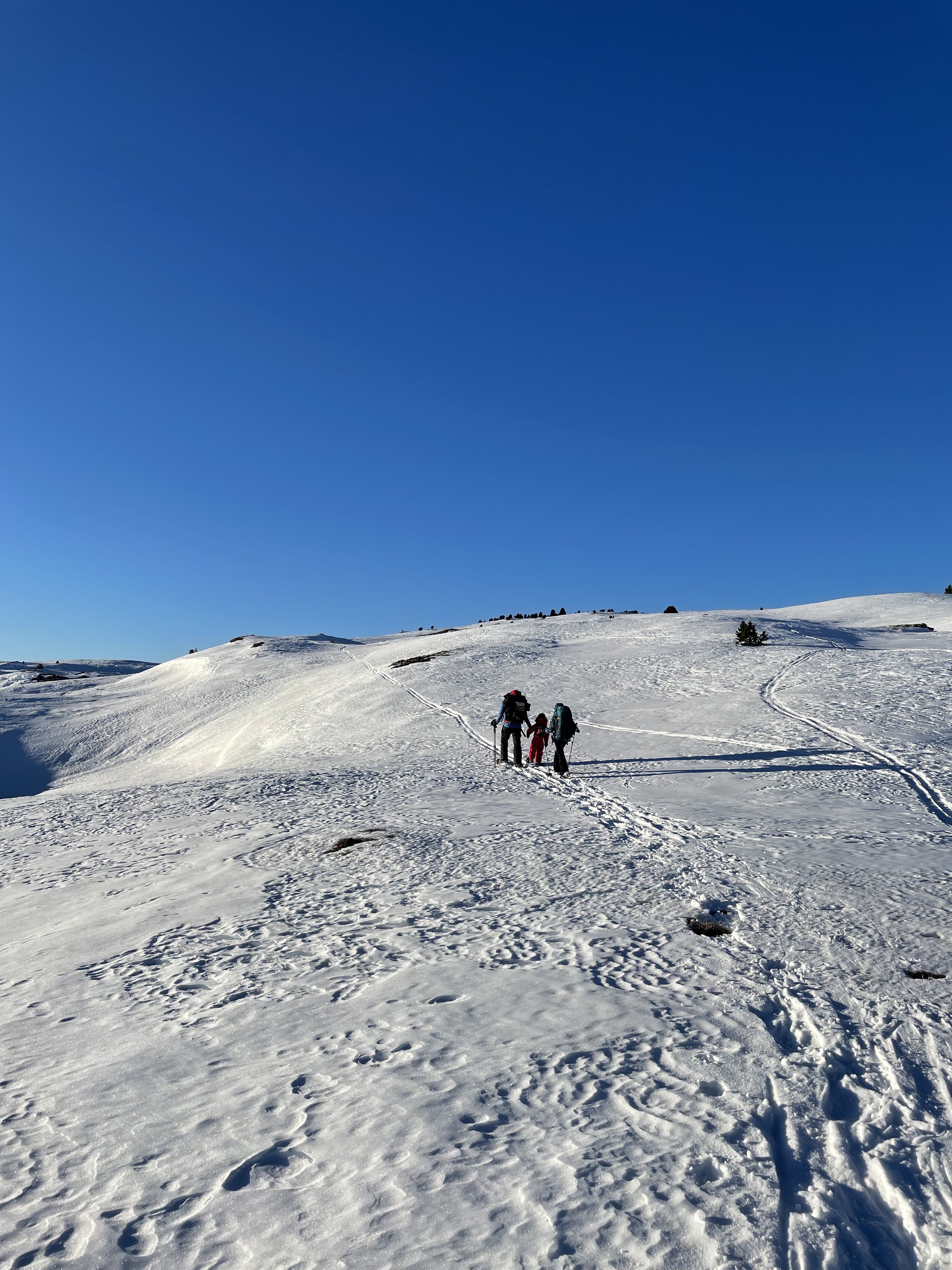 Ensuite, pendant que les parents remballent le matériel, les enfants vont faire de la luge (et oui nous avons transporté 3 luges à fesses !!) sur les hauteurs autour de la Cabane. La zone est légèrement encaissée et le soleil ne pointera pas le bout de son nez avant notre départ.