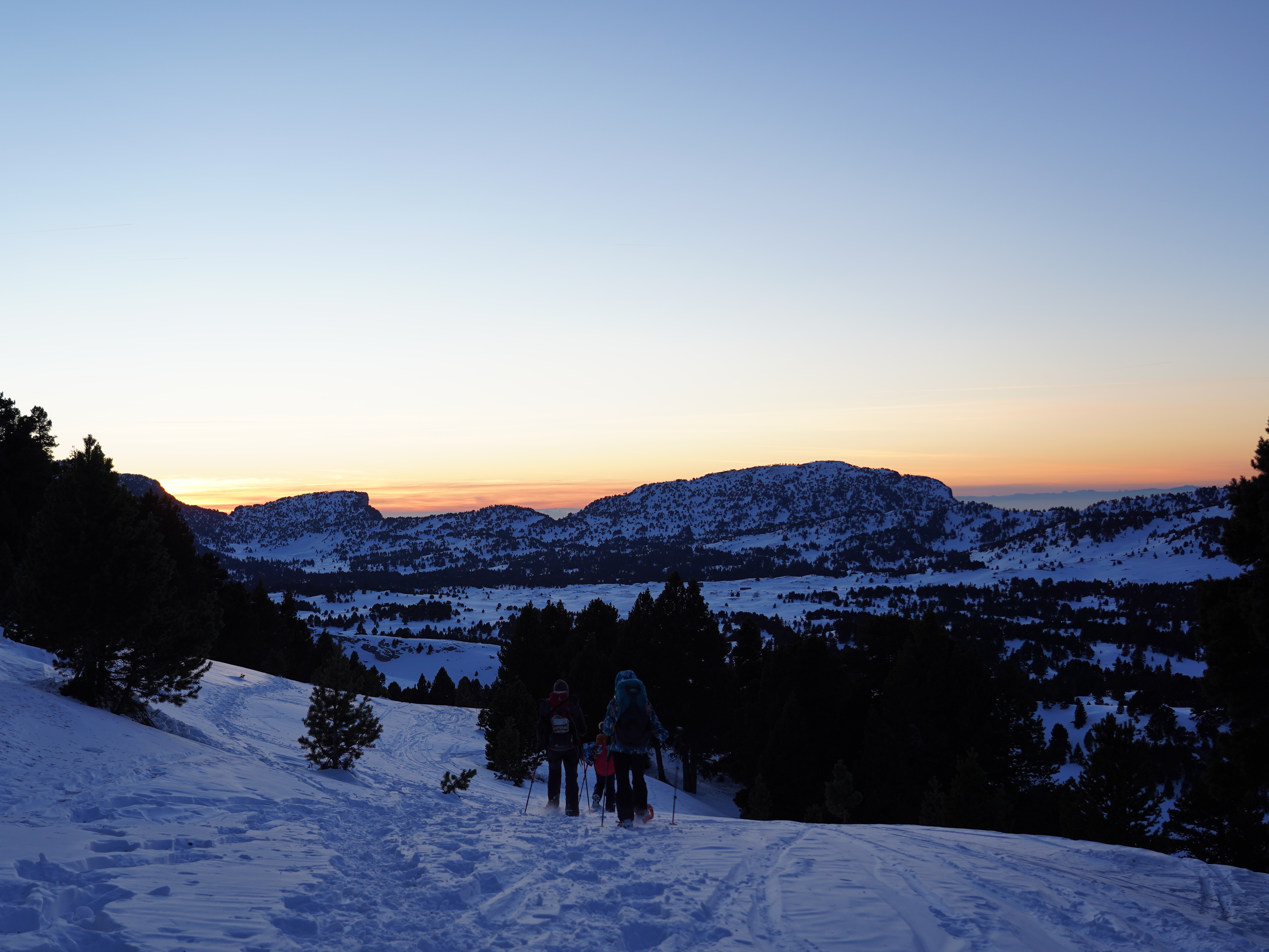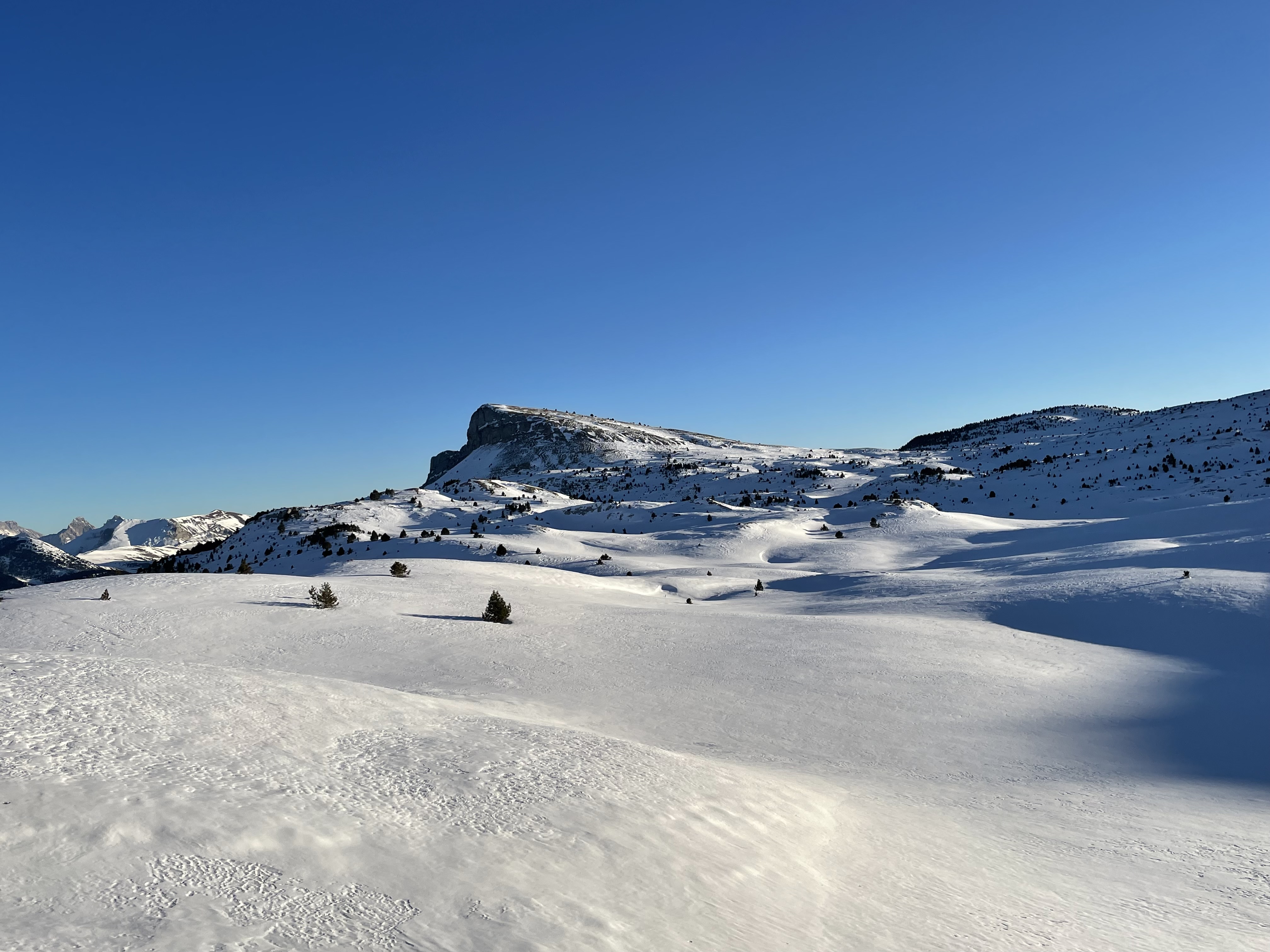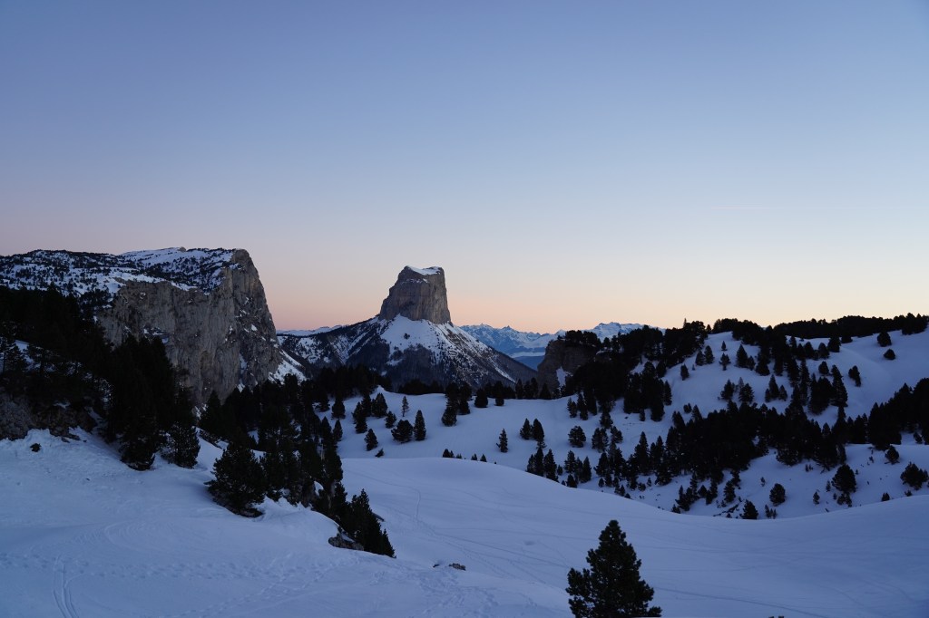 Nous poursuivons à notre rythme mais en évitant désormais les pauses car il nous faut arriver avant la nuit, et le soleil se couche tout juste avant 17h à cette période ! Nous dépassons la bergerie de Chamousset sans nous arrêter. Et nous poursuivons en direction du pas de la Chèvrerie. Nous apercevons enfin en toile de fond le Mont Aiguille avec les dernières lueurs de soleil de la journée.