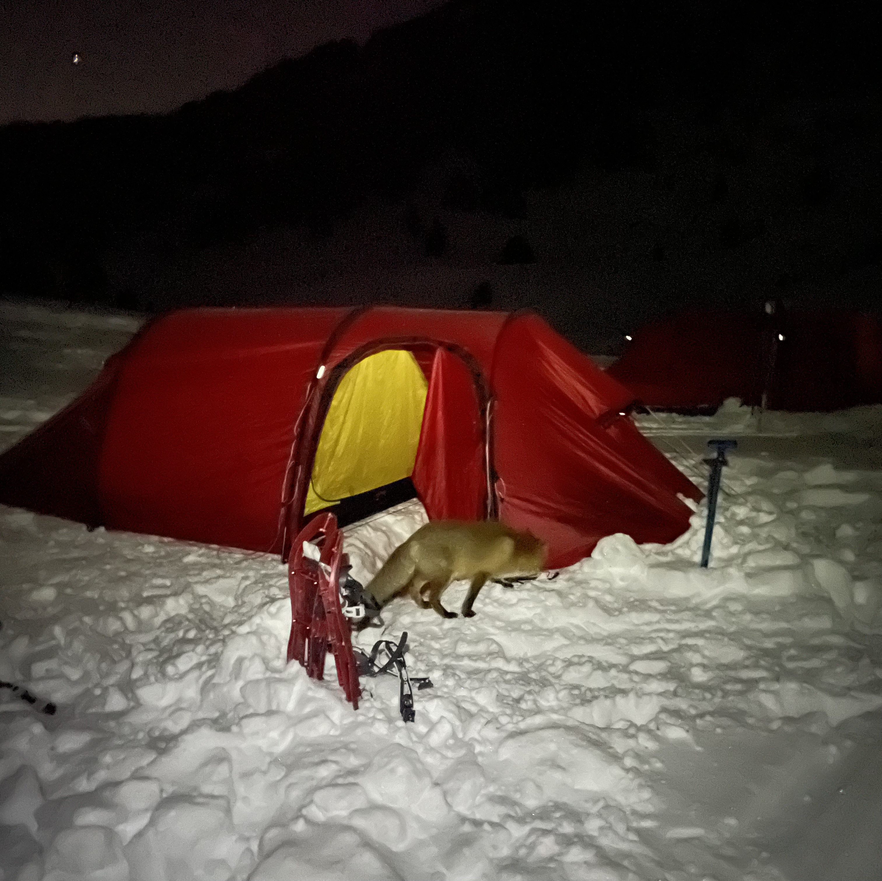La température dans le chalet est très bonne, le poêle tourne à fond depuis probablement un moment et le gîte a été rénové récemment et est très bien isolé. Seules 3 personnes passent la nuit dans la cabane, les autres dînent sur place et rejoindront leur tente ensuite. Nous faisons connaissance avec le renard de Chaumailloux, absolument pas apeuré par les humains et bien déterminés à récupérer les provisions et déchets des campeurs.