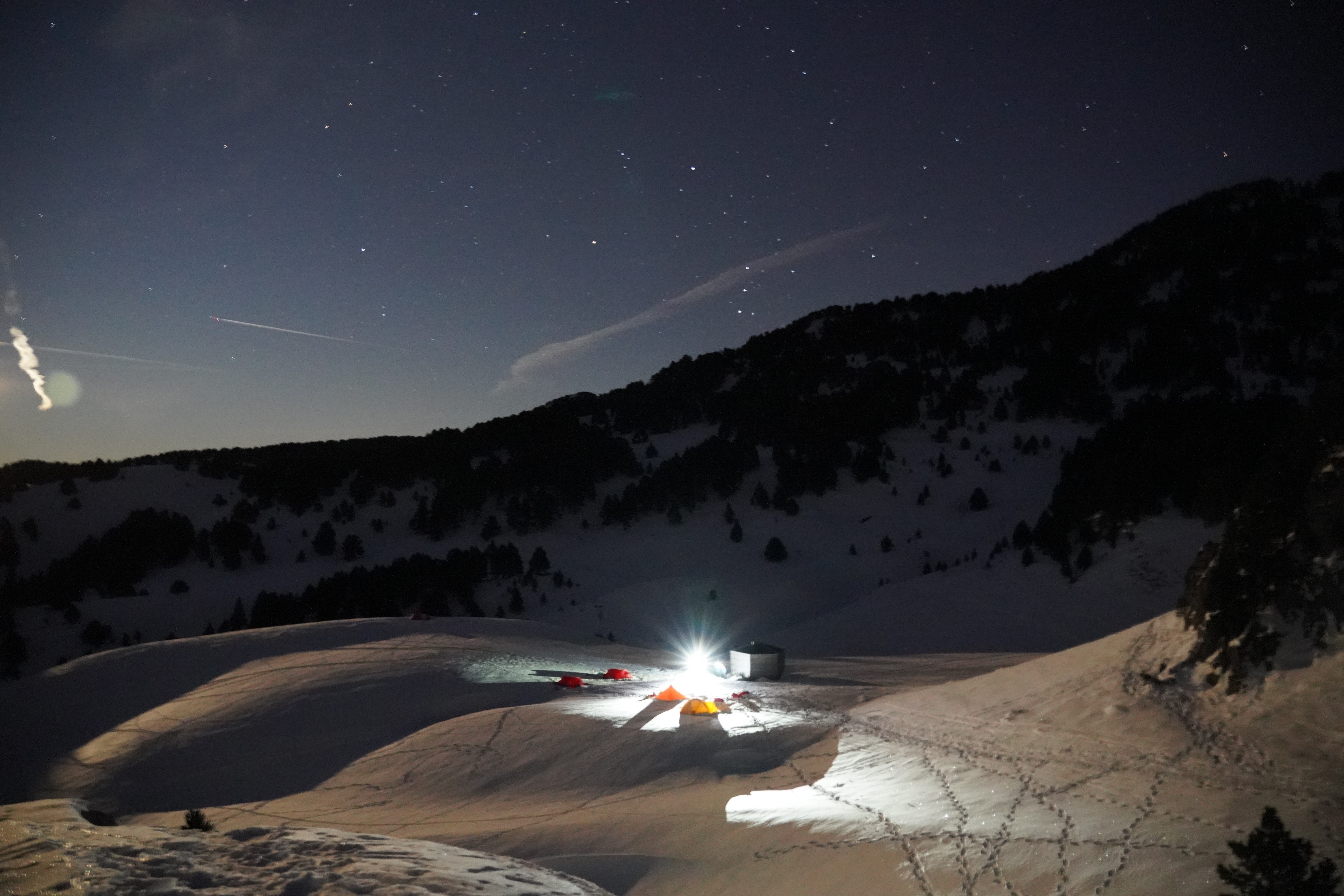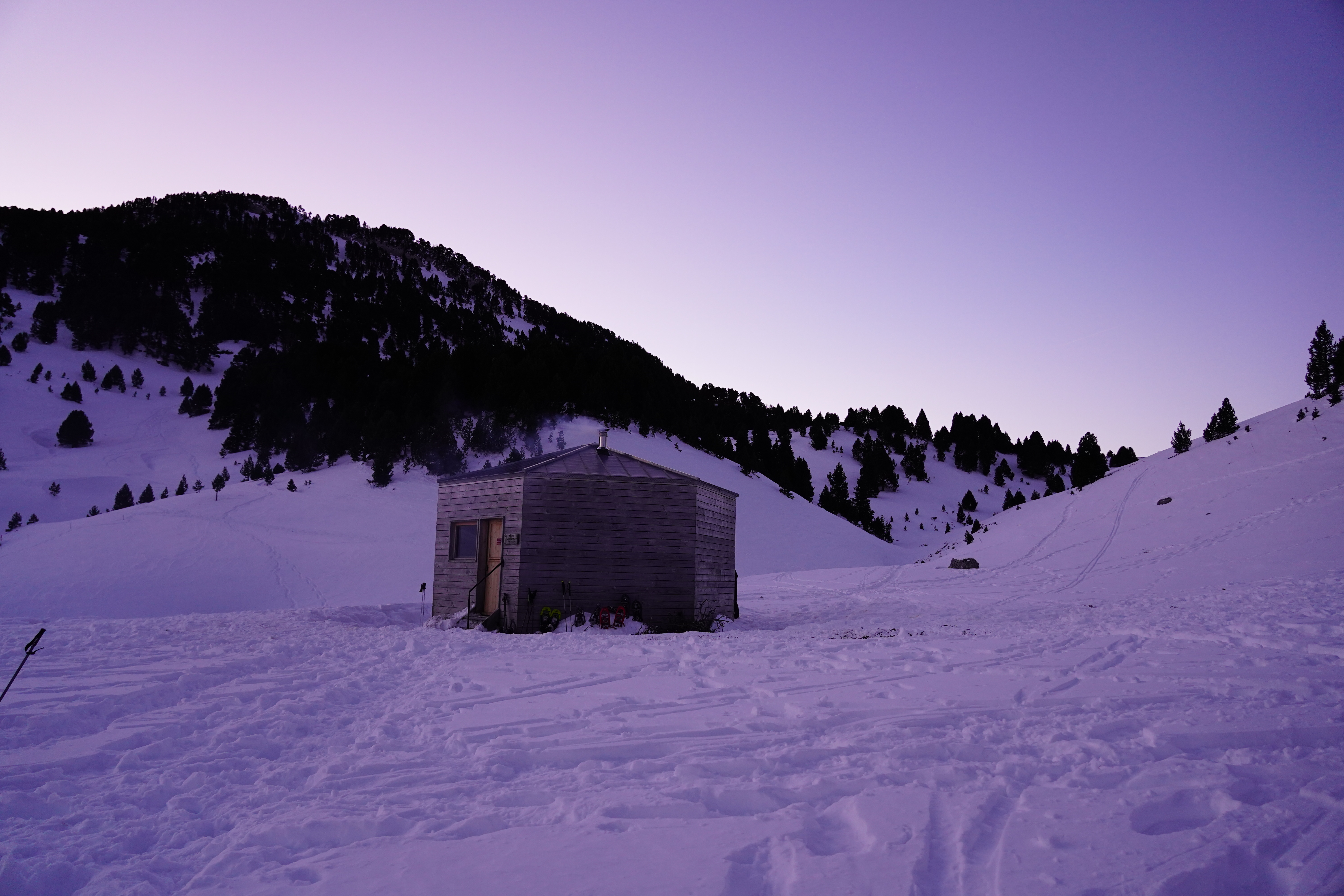 Nous entamons notre descente vers la Cabane de Chaumailloux. On peut apercevoir de loin qu’il y a plusieurs tentes installées à proximité. On croise alors les doigts très fort pour qu’il y ait de la place pour nous dans la Cabane !! Arrivés sur place, la cabane est trèèès remplie par de nombreuses personnes qui se tiennent bien au chaud auprès du pôele, et qui dormiront en tente juste à côté. Nous voilà rassurés !