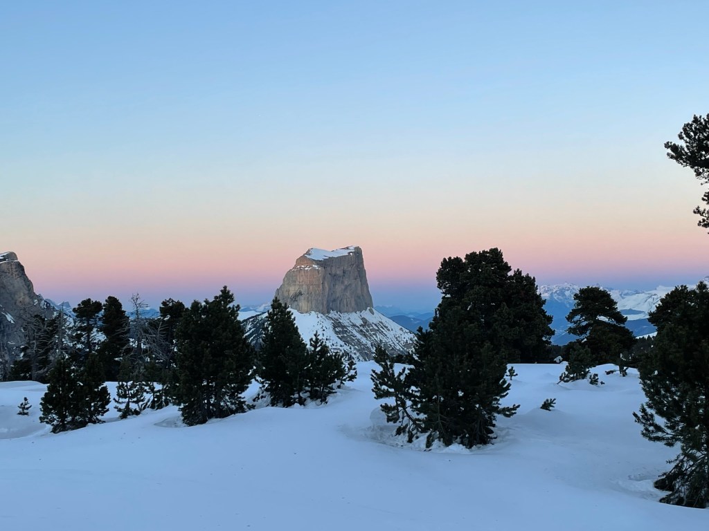 C’est parti pour le retour. Nous quittons cette chouette cabane. Nous empruntons le même chemin, et très vite nous prenons de la hauteur. Le soleil perce par-dessus un flanc de montagne. Et nous immortalisons encore ce magnifique Mont Aiguille.