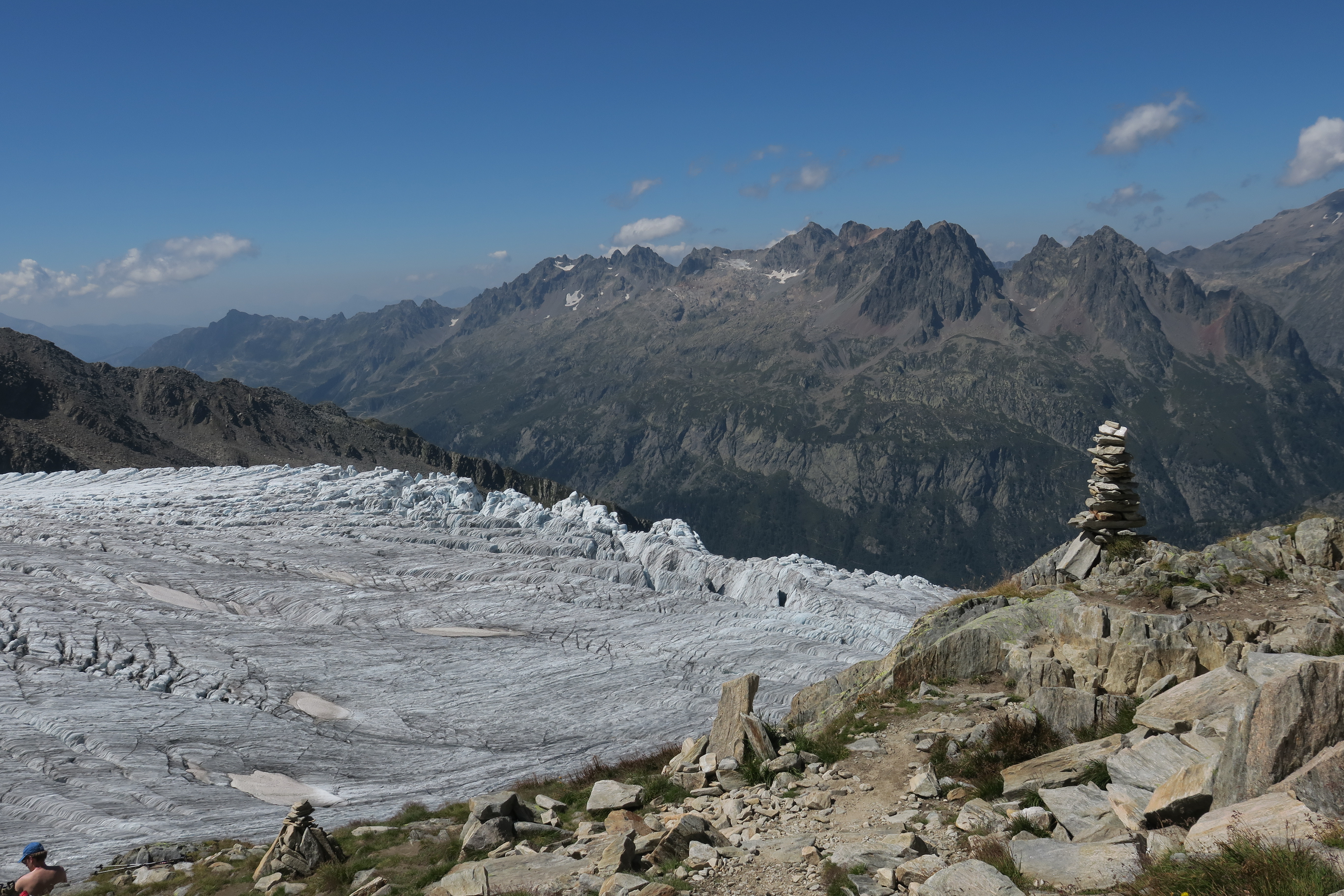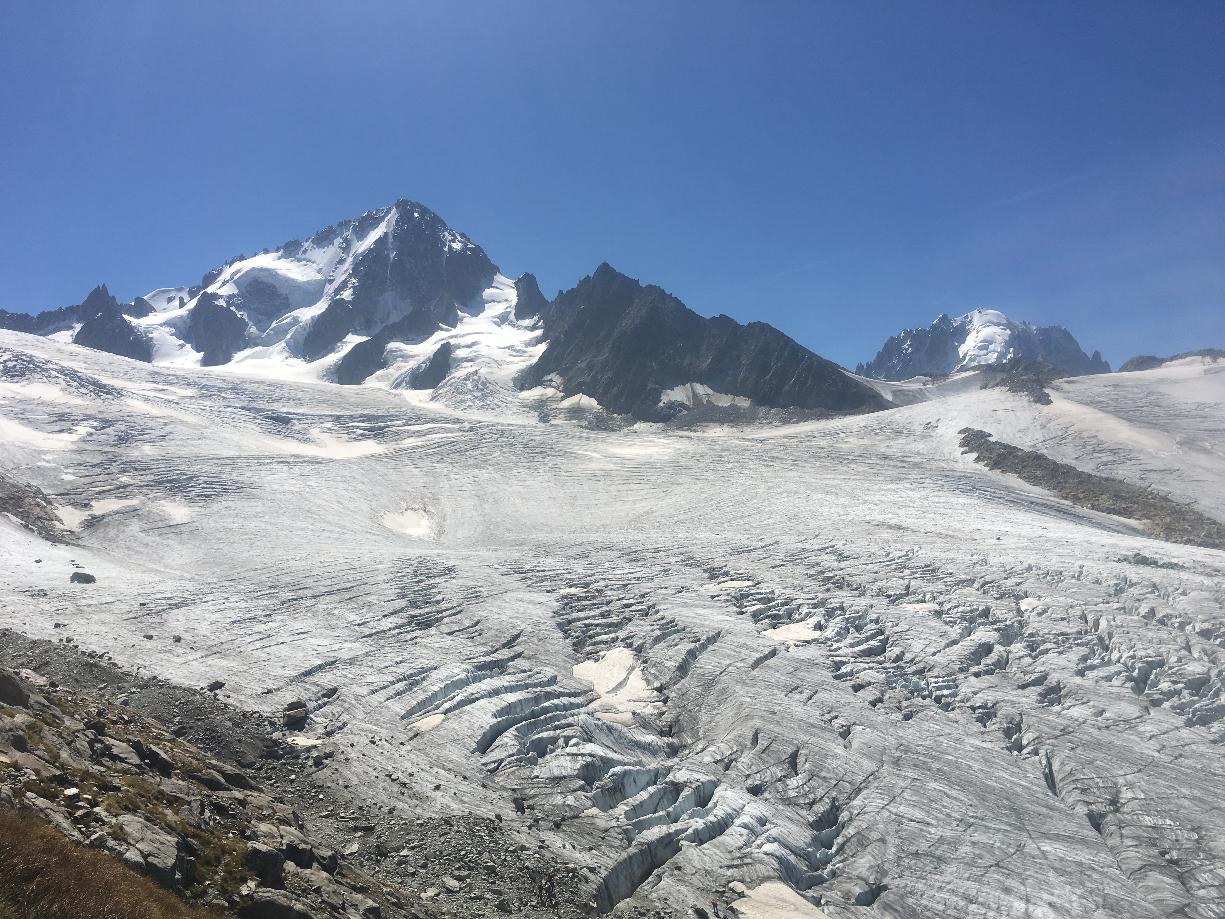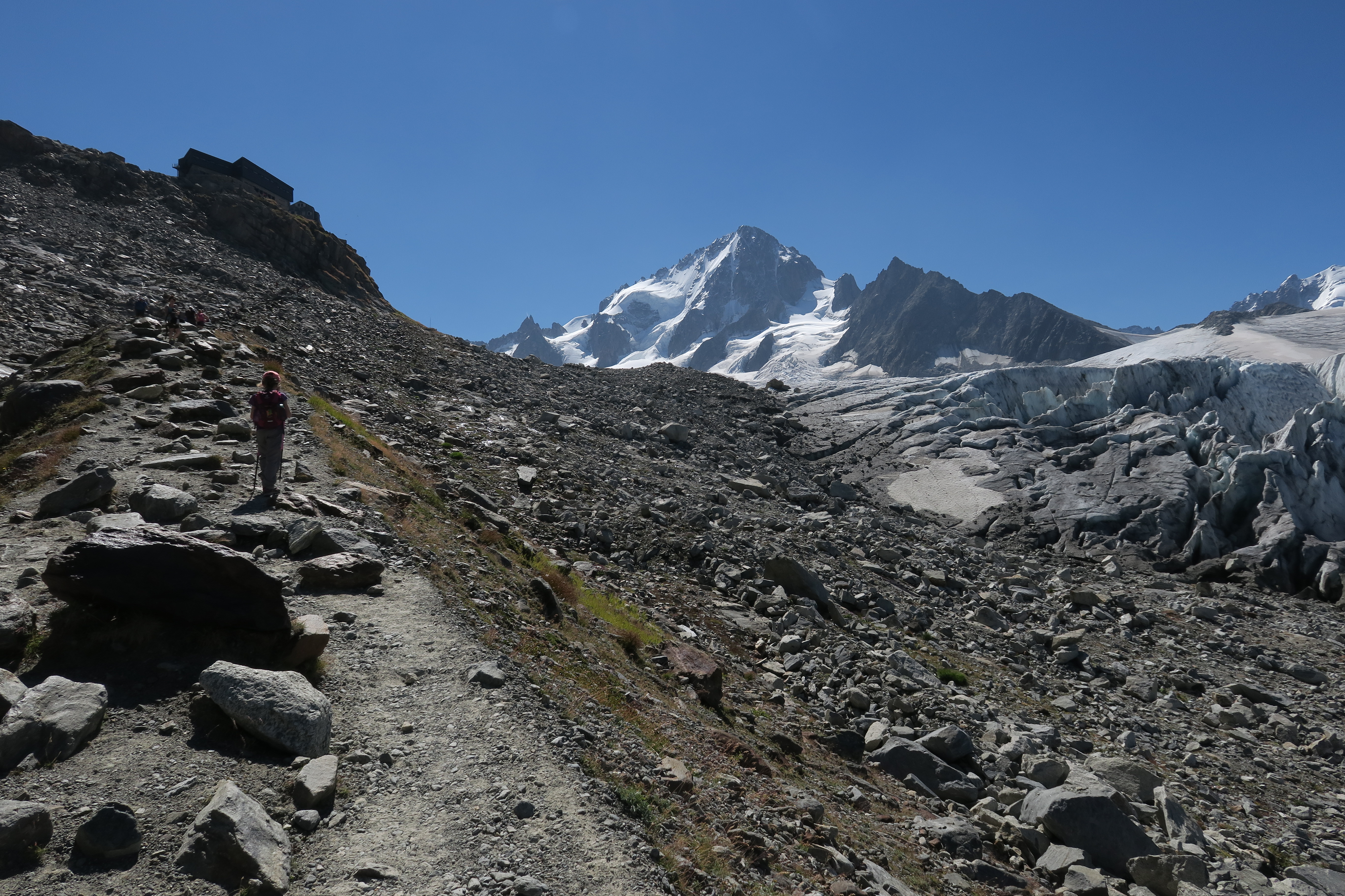 La récompense arrive après une dernière montée d’une pente assez soutenue dans un terrain pas très stable. Vous pourrez pic-niquez (ou mangez au refuge) en bord de glacier.