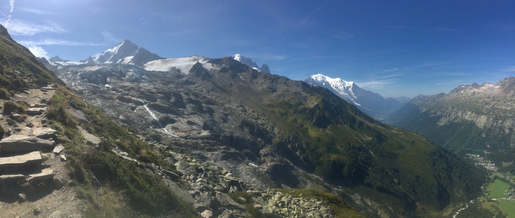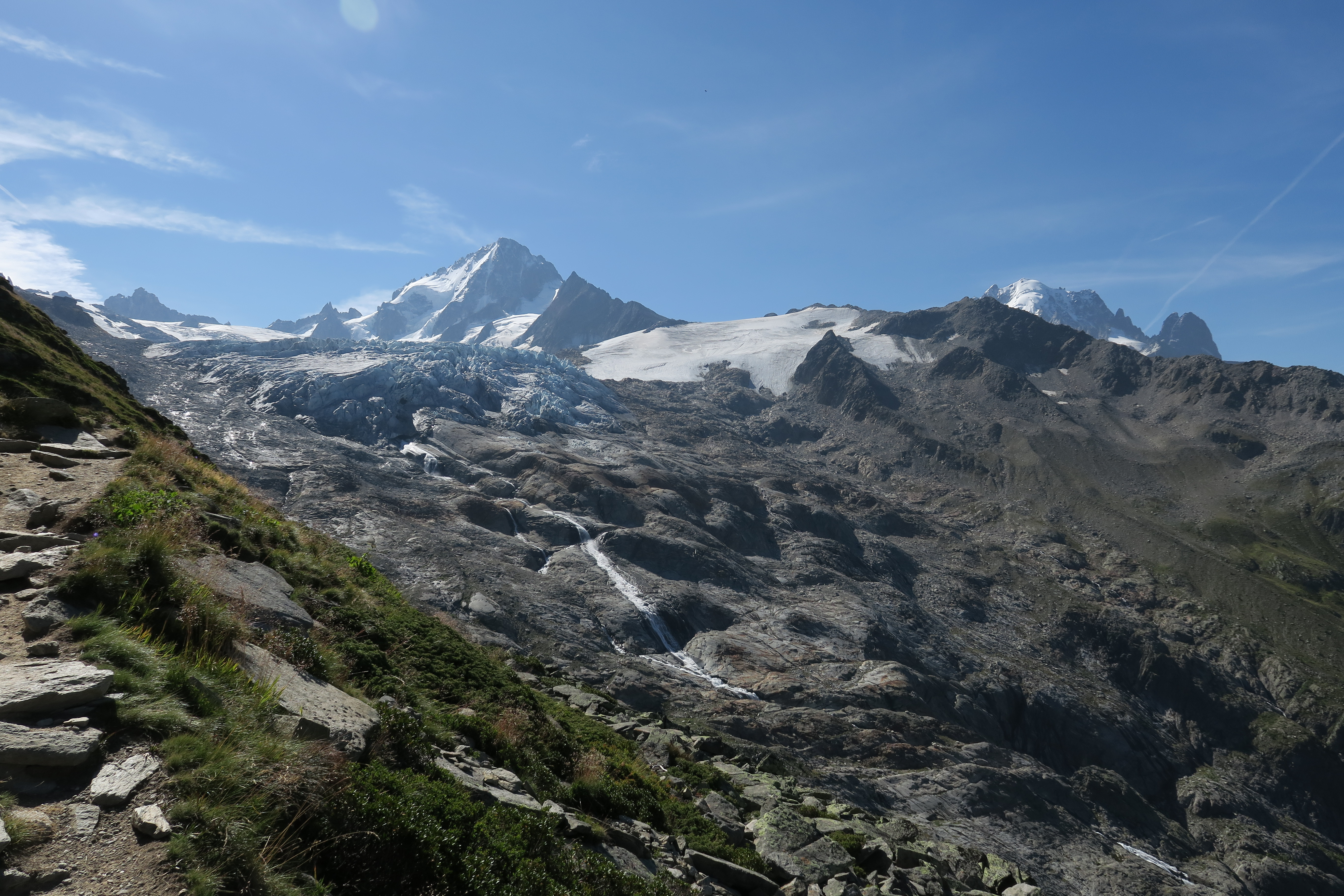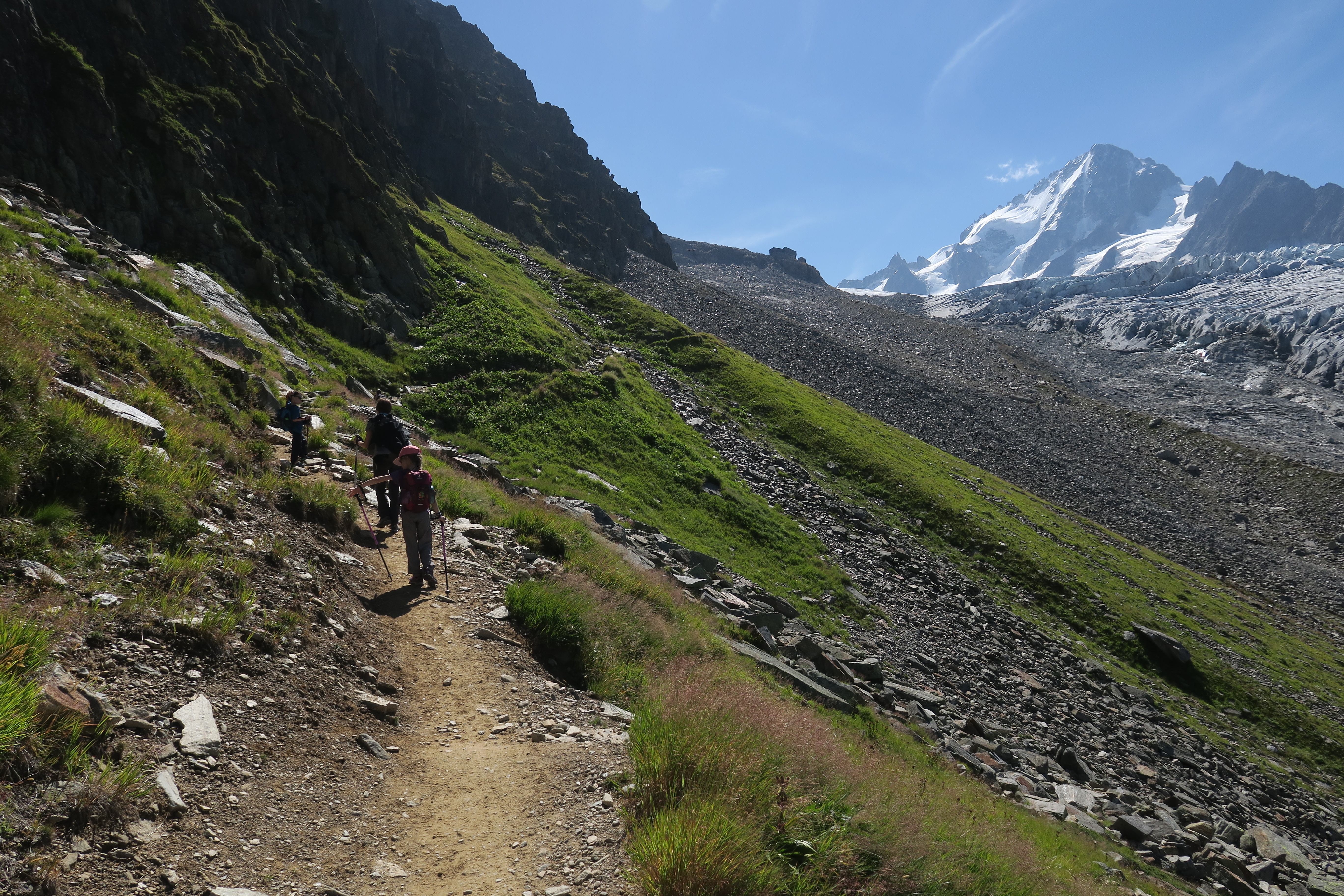 La récompense arrive après une dernière montée d’une pente assez soutenue dans un terrain pas très stable. Vous pourrez pic-niquez (ou mangez au refuge) en bord de glacier.