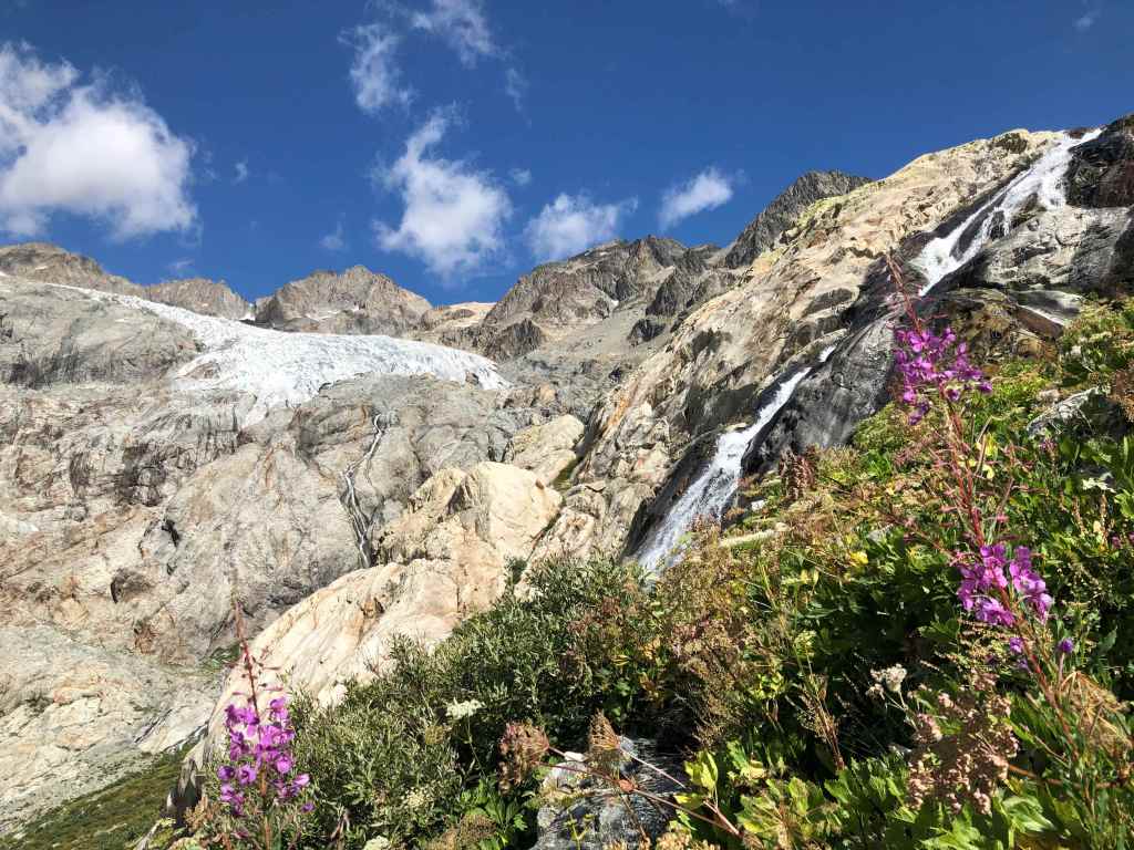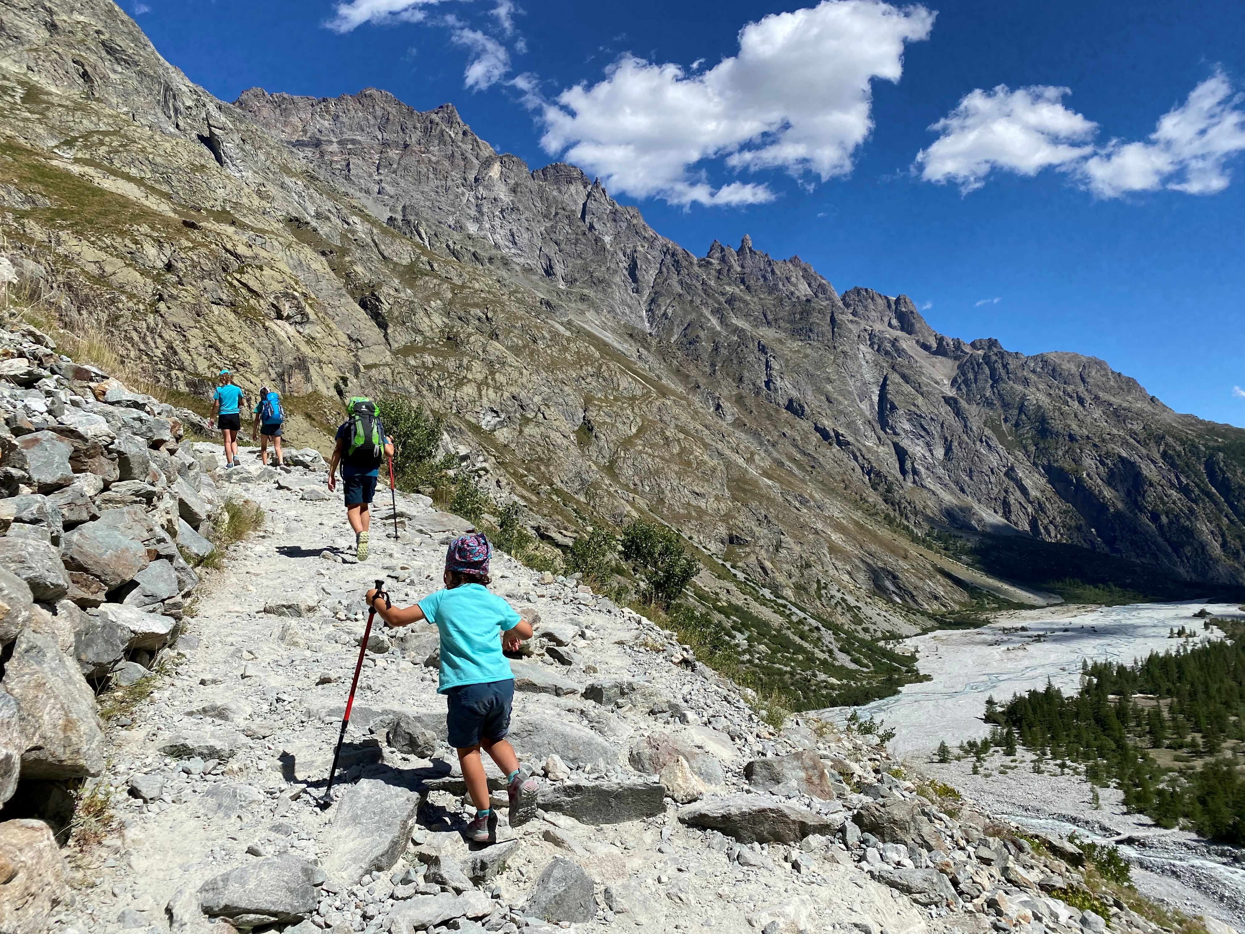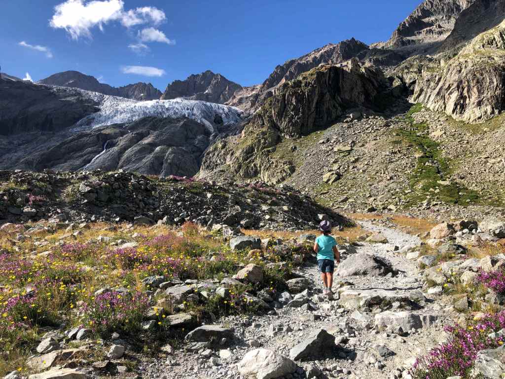 - Difficulté : difficile – Le chemin est bien tracé, sans difficulté particulière en première partie, mais cela monte bien pour de très jeunes enfants. A la fin, il y a quelques passages avec des câbles sur des rochers, avant le refuge, mais accessibles pour des jeunes enfants habitués à marcher / escalader. Pour poursuivre au-delà du refuge du glacier blanc, le sentier n’est pas très visible, et très escarpé et sinueux. Il faut un pied sûr. A noter également qu’il ne faut pas s’aventurer sur le glacier sans équipement spécifique et compétences en haute-montagne.