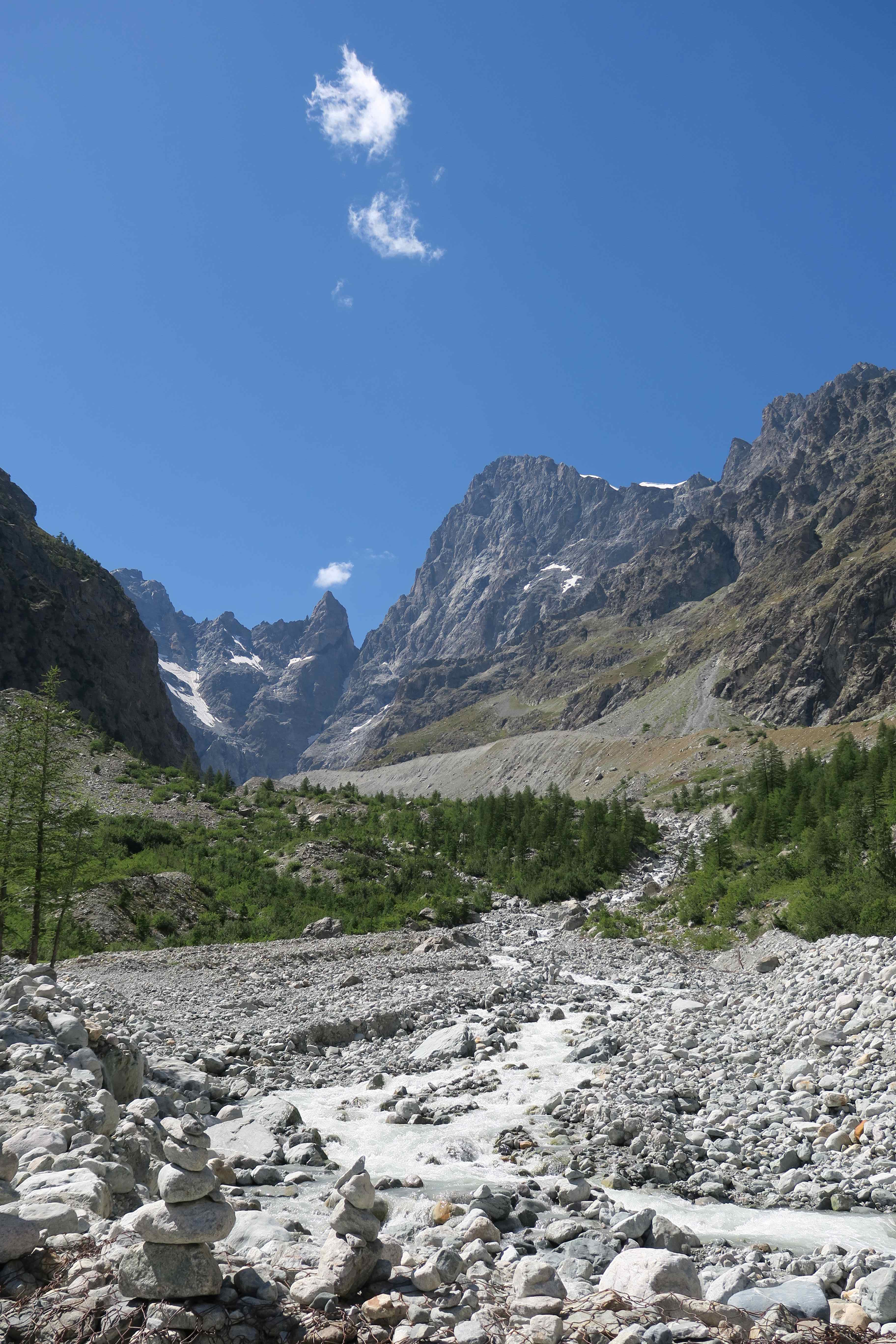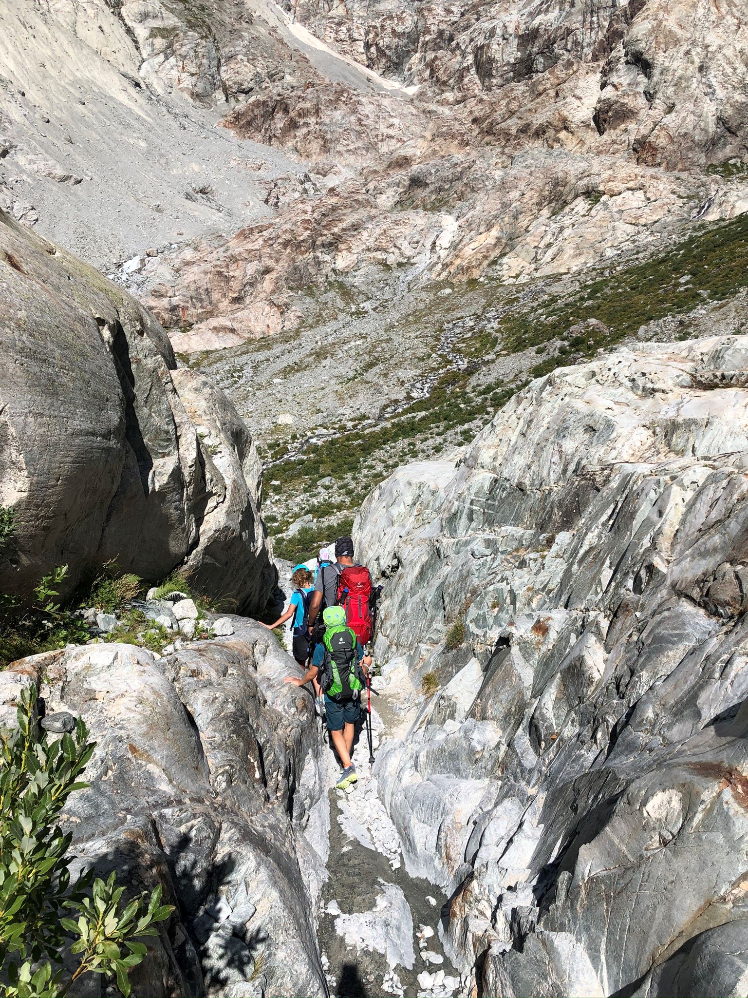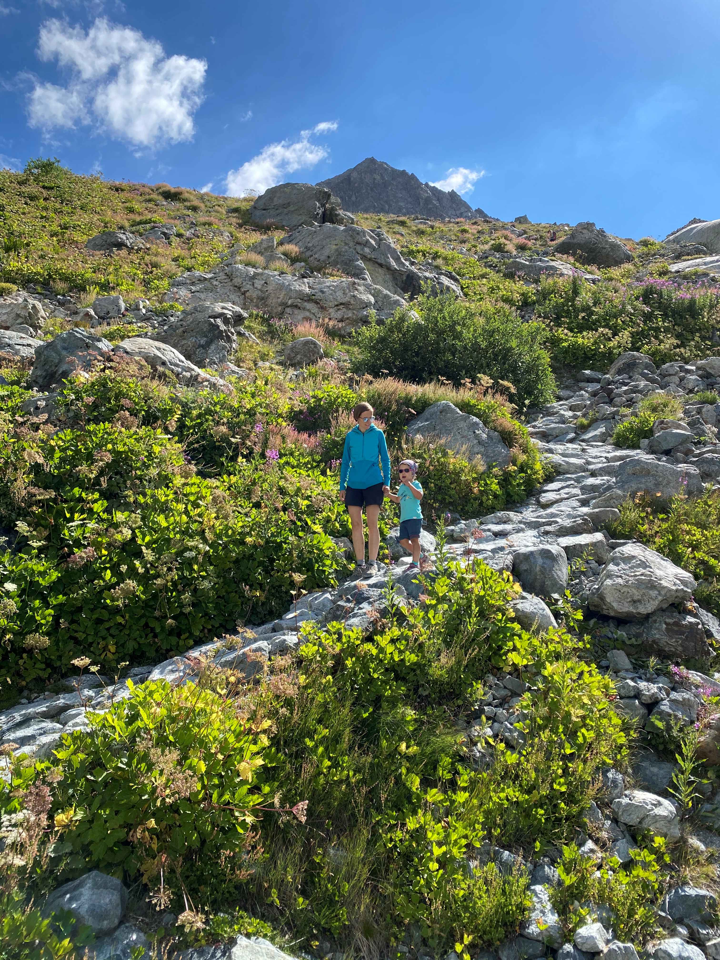 - Difficulté : difficile – Le chemin est bien tracé, sans difficulté particulière en première partie, mais cela monte bien pour de très jeunes enfants. A la fin, il y a quelques passages avec des câbles sur des rochers, avant le refuge, mais accessibles pour des jeunes enfants habitués à marcher / escalader. Pour poursuivre au-delà du refuge du glacier blanc, le sentier n’est pas très visible, et très escarpé et sinueux. Il faut un pied sûr. A noter également qu’il ne faut pas s’aventurer sur le glacier sans équipement spécifique et compétences en haute-montagne.