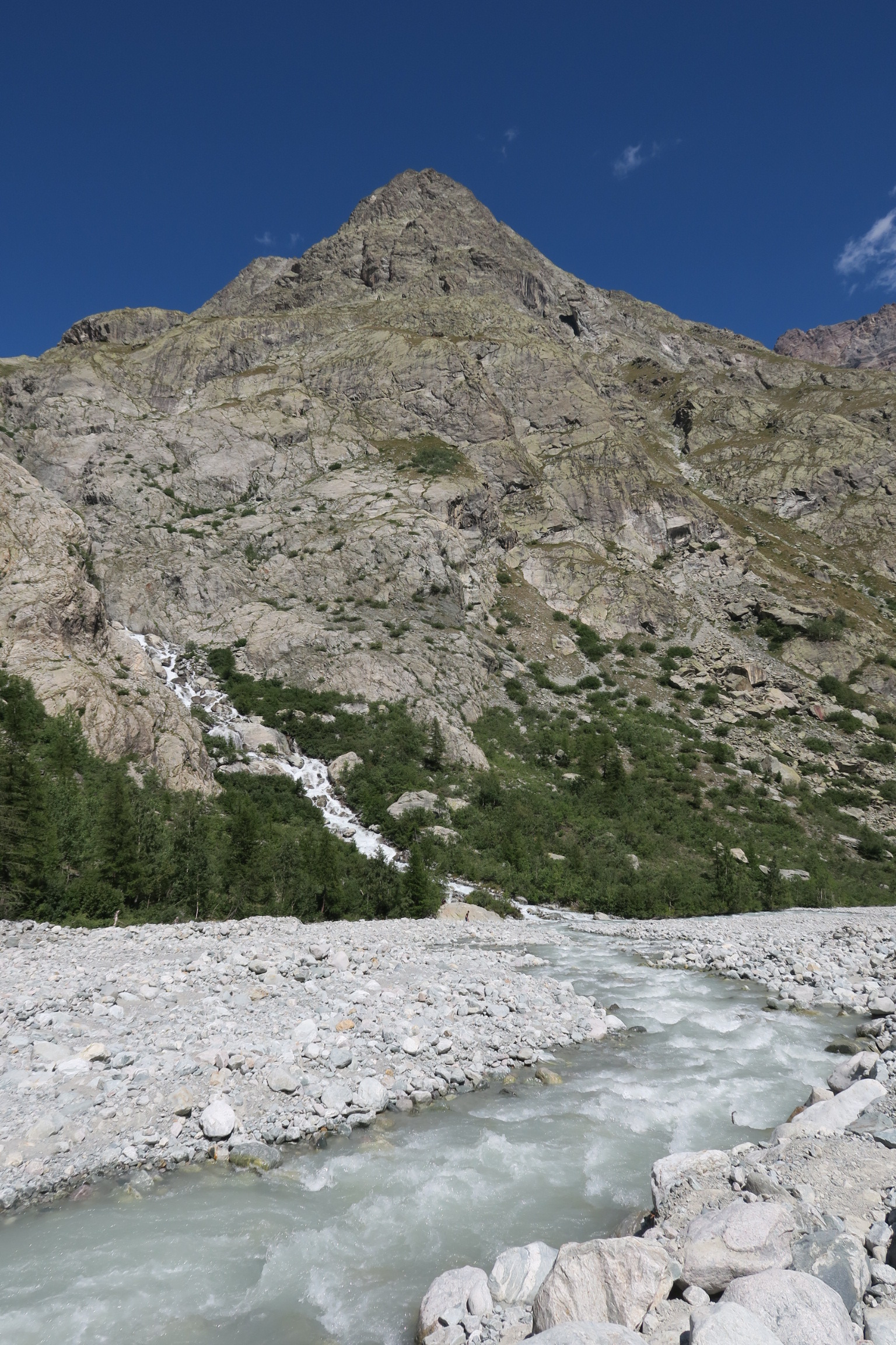 Le sentier continue à grimper, et donne de beaux points de vue sur le torrent en contrebas. On arrive à un pont, avec le glacier en toile de fond, lieu parfait pour une pause ou un pic-nic.