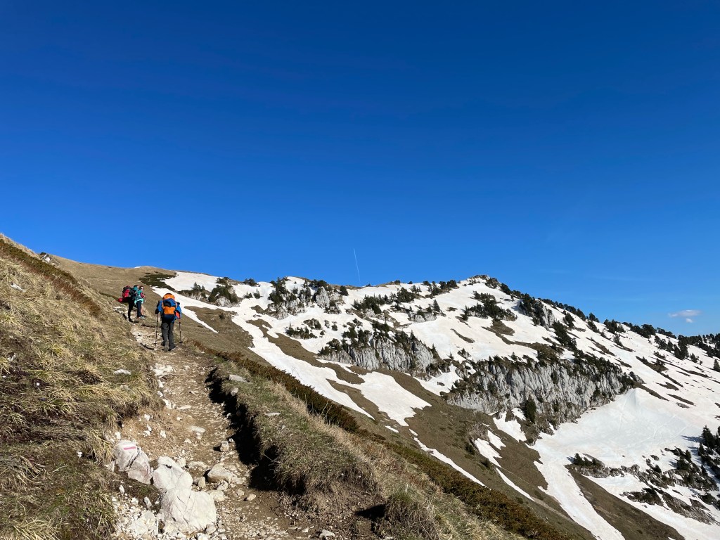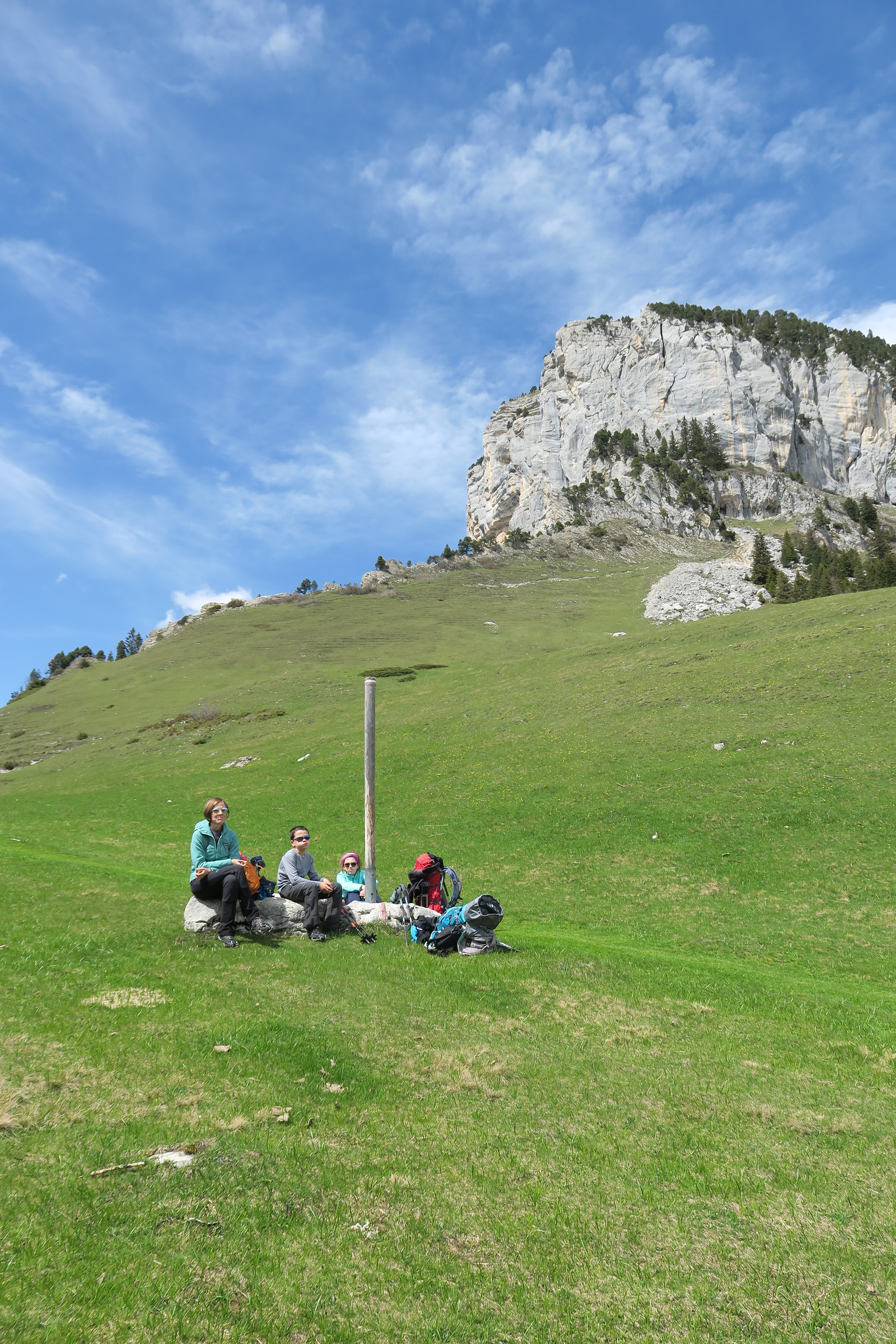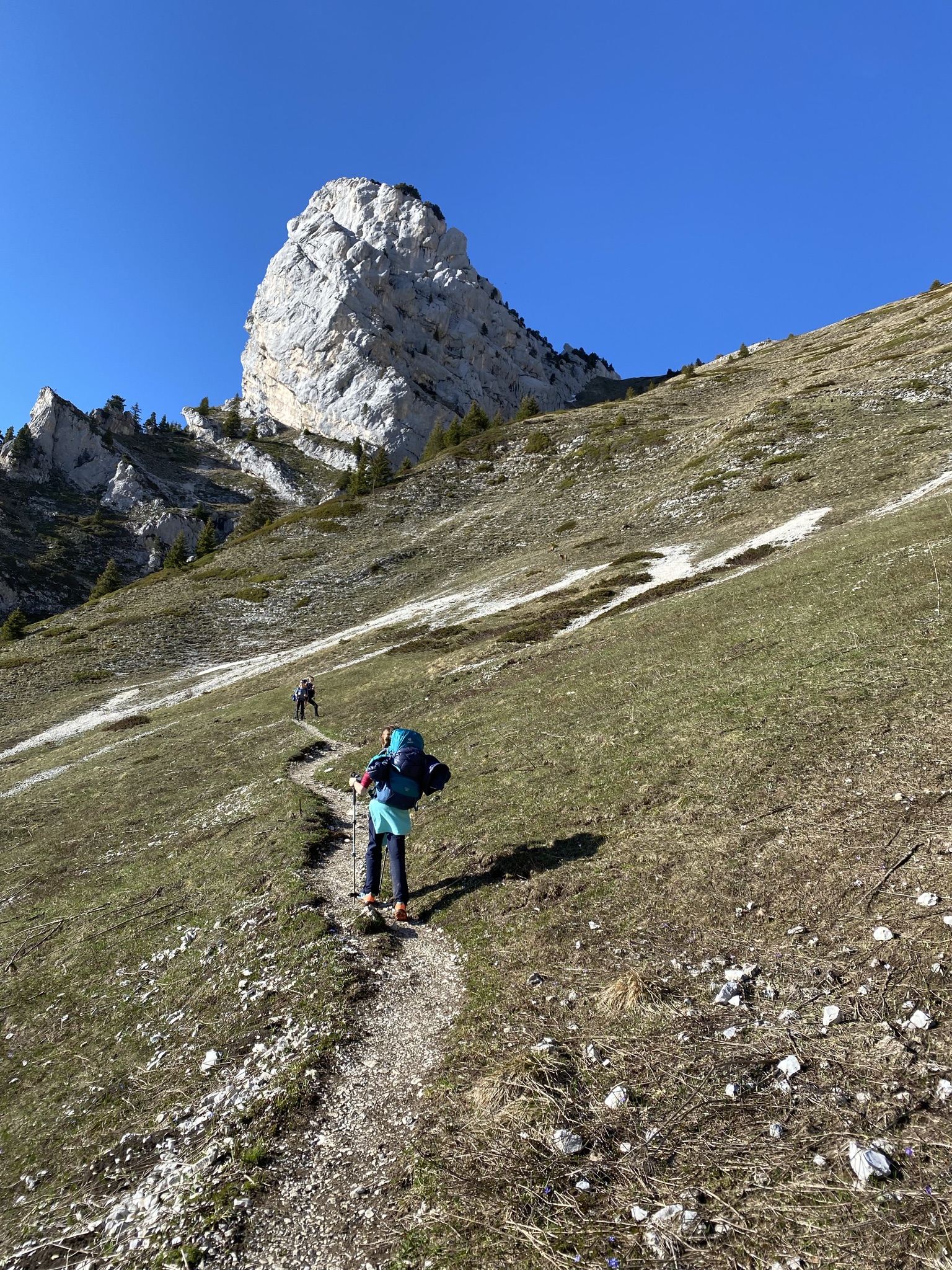 Nous arrivons enfin au Col du Coq, notre point de départ prévu initialement, déjà un peu fatigués et nous faisons notre pause déjeuner. Et puis nous partons direction la dent de Crolles, qui se dévoile rapidement, imposante. Arrivés au col de Ayes, un lacet serpente dans la prairie. Nous avions imaginé faire un détour par la dent sur ce premier jour, mais étant donné notre bonus de départ, il n’en est plus du tout question ! Nous croisons de nombreux randonneurs car l’itinéraire menant à la dent de Crolles est très prisé dans la région de Grenoble.
