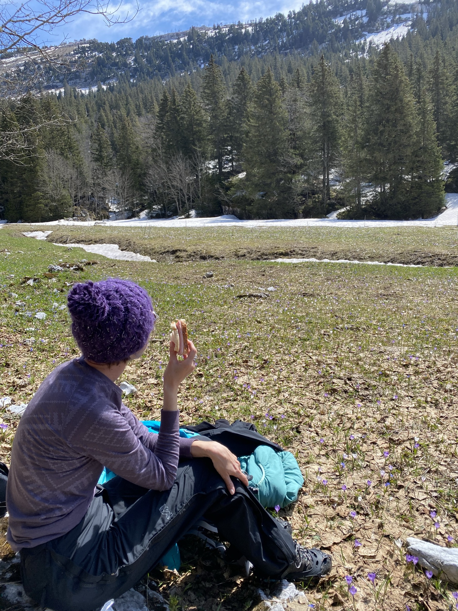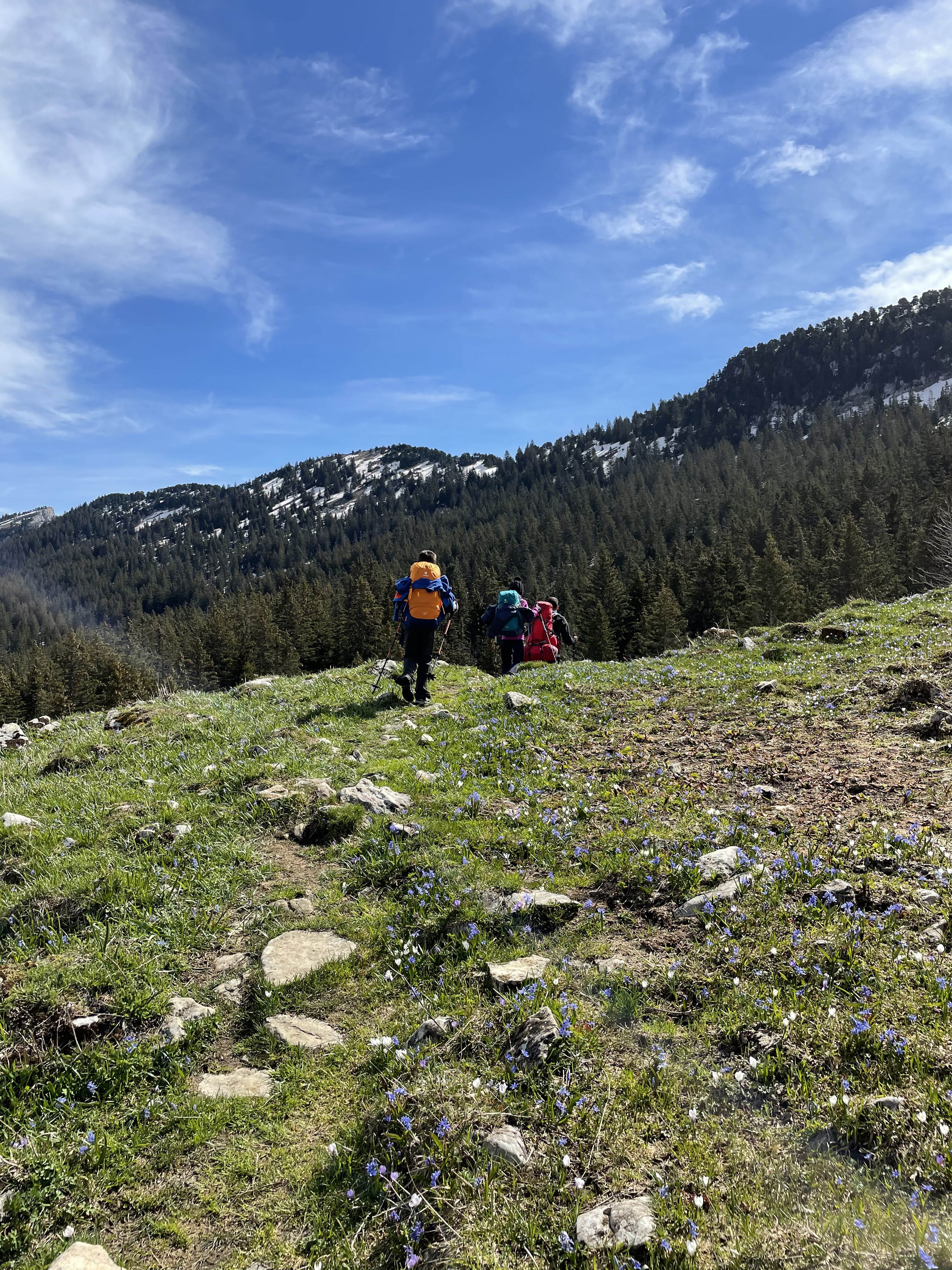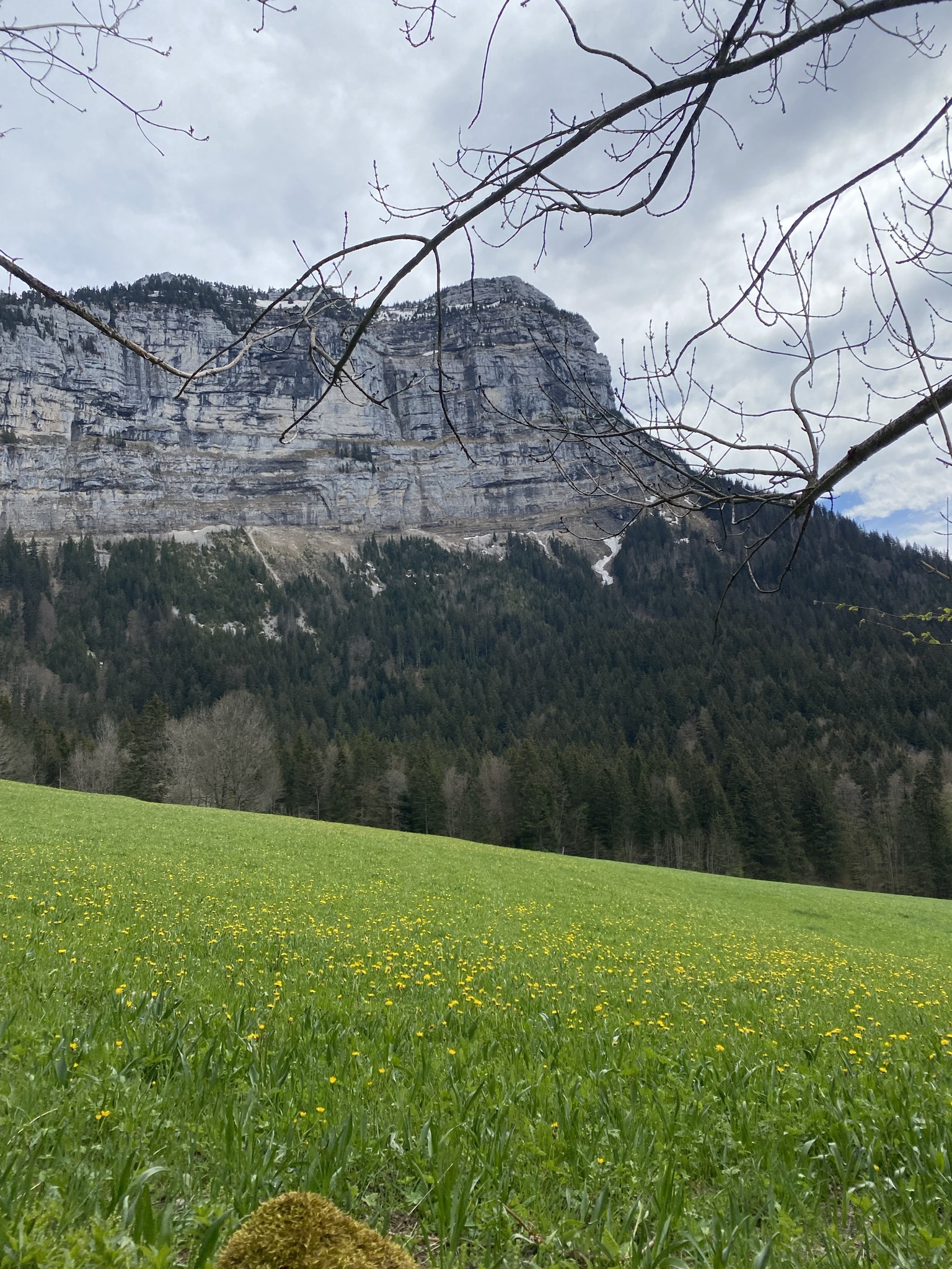 Nous arrivons enfin au Col du Coq, notre point de départ prévu initialement, déjà un peu fatigués et nous faisons notre pause déjeuner. Et puis nous partons direction la dent de Crolles, qui se dévoile rapidement, imposante. Arrivés au col de Ayes, un lacet serpente dans la prairie. Nous avions imaginé faire un détour par la dent sur ce premier jour, mais étant donné notre bonus de départ, il n’en est plus du tout question ! Nous croisons de nombreux randonneurs car l’itinéraire menant à la dent de Crolles est très prisé dans la région de Grenoble.