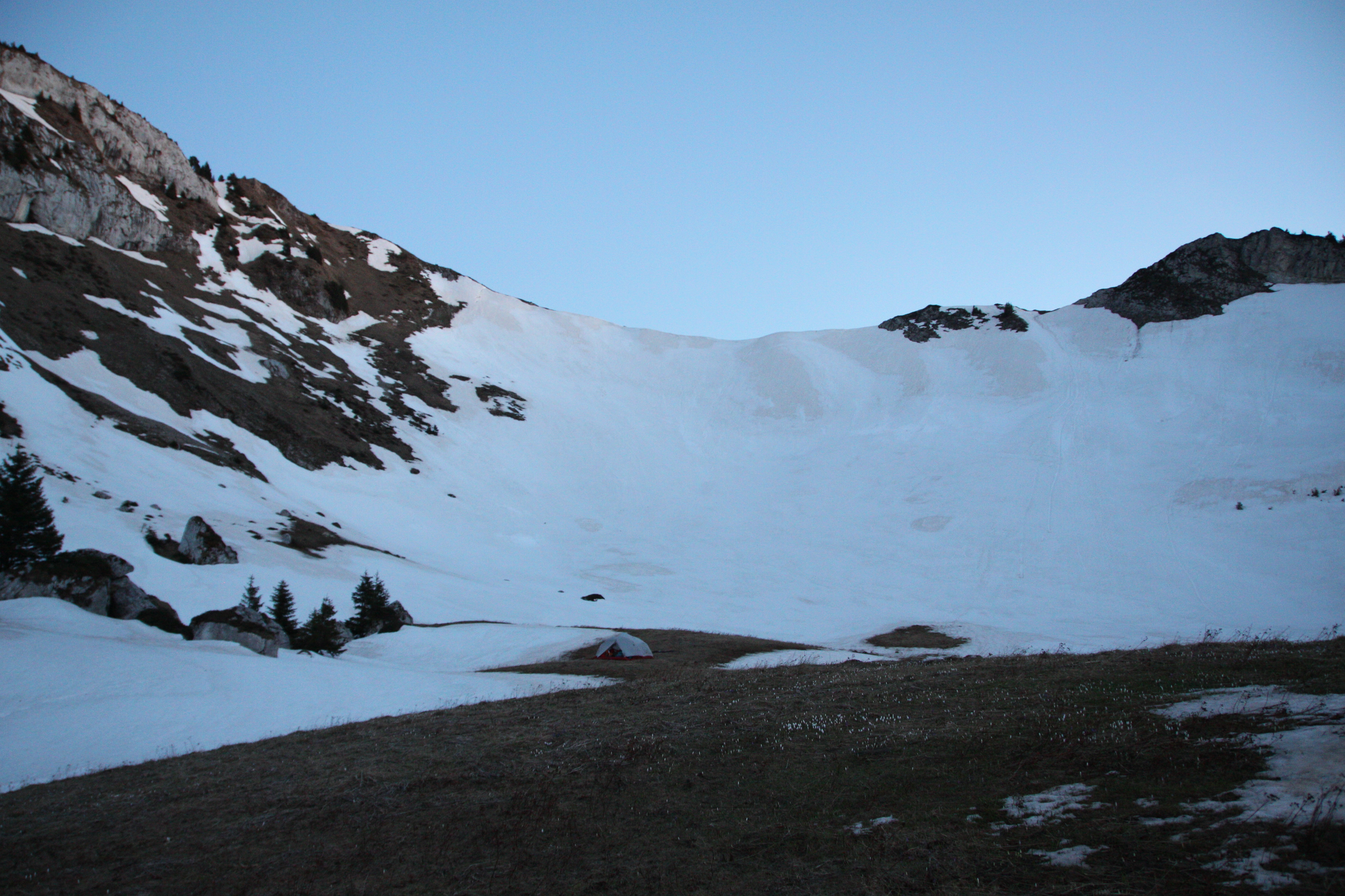 Nous sommes encore loin de notre point de bivouac prévu : le vallon de Marcieu où nous pensons trouver des étendues d’herbe dans une zone avec peu de dénivelé. Nous hésitons à trouver un lieu de bivouac au pied du col, avant sa montée. Une tente est déjà installée dans les parages, en hauteur par rapport à la cabane de Bellefont (sous la Lance Sud de Malissard). Mais les terrains sont pentus et assez peu propices à l’installation d’une tente 4 places.