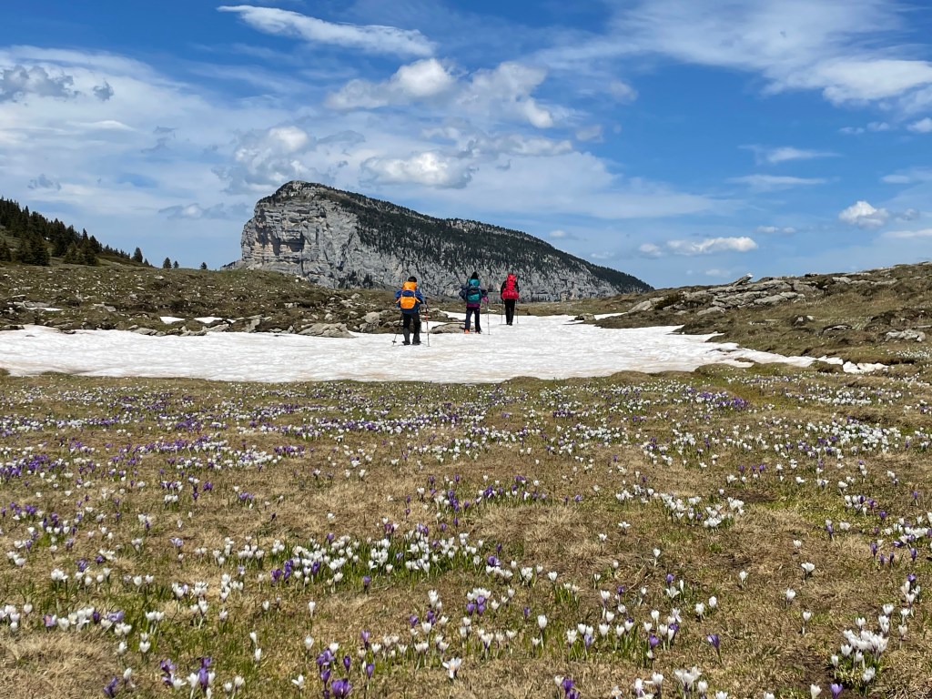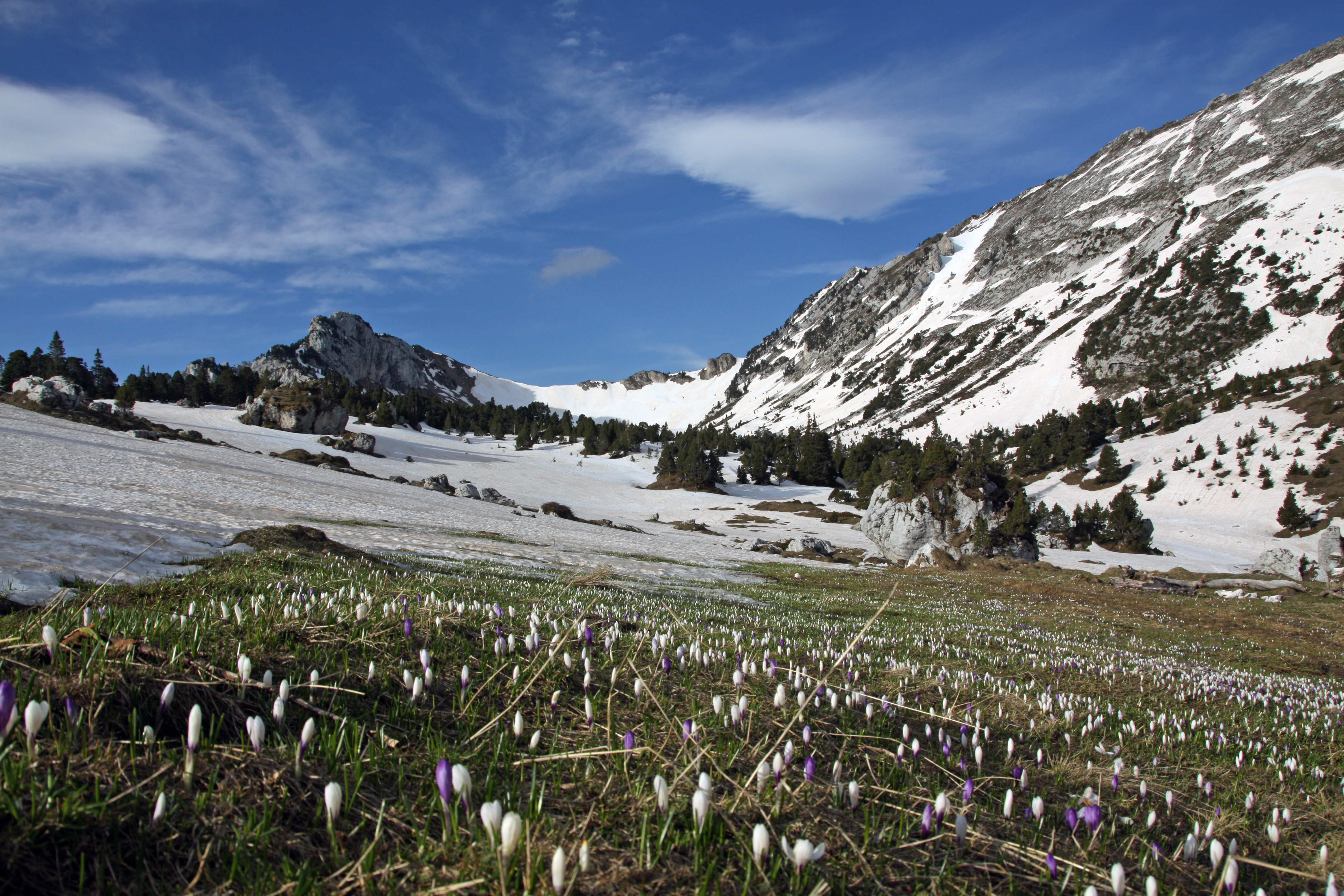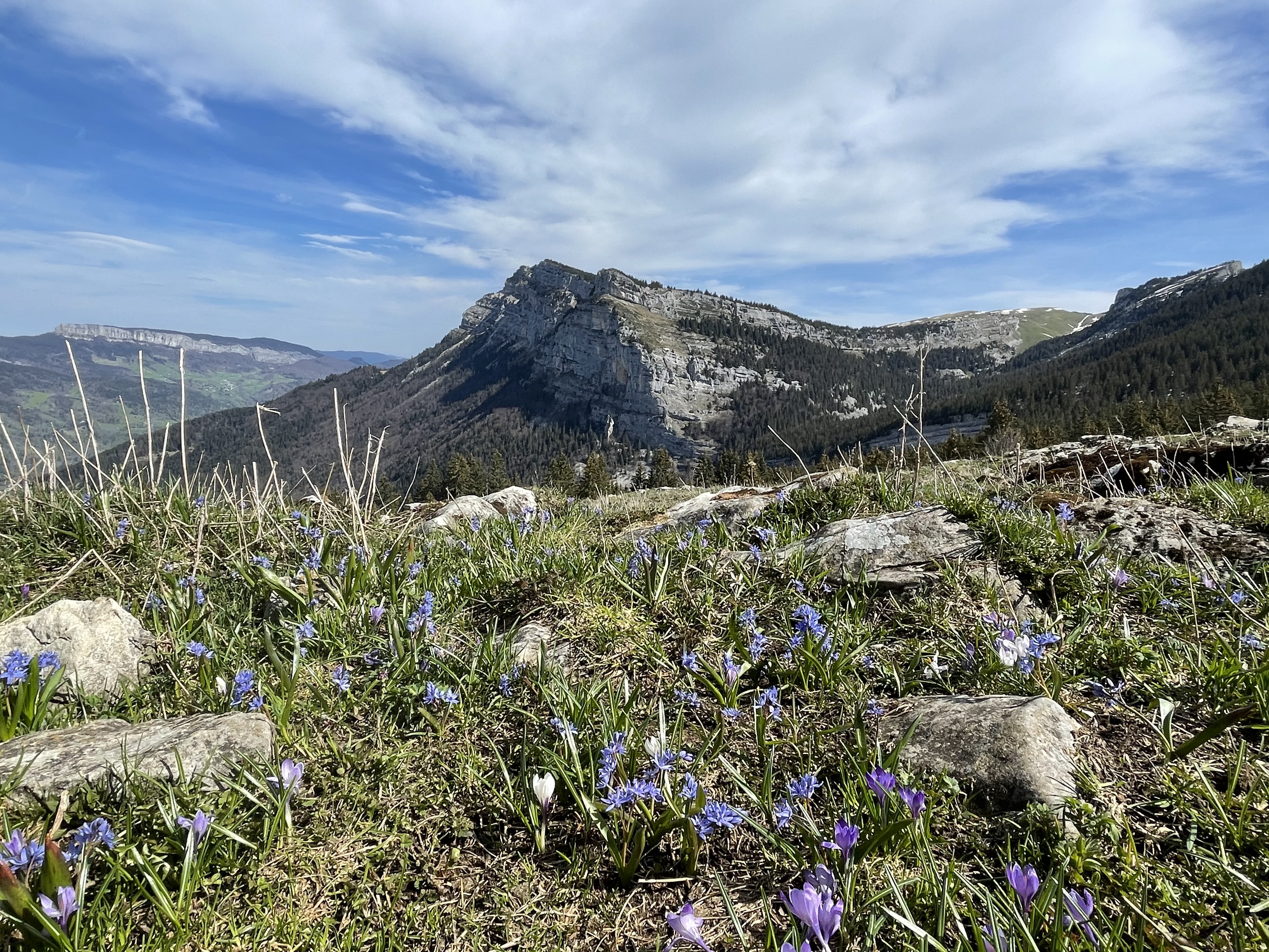 Après avoir parcouru encore un petit vallon encaissé, on débouche sur l’alpage de l’Alpe. Les crocus sont encore présents par centaines et donnent un joli air de printemps aux alpages encore partiellement recouverts de neige. Sur l’alpage de l’Alpe, la vue s’ouvre progressivement sur le Mont Granier qui apparaît en fond avec sa face Sud (Tête de Lion).