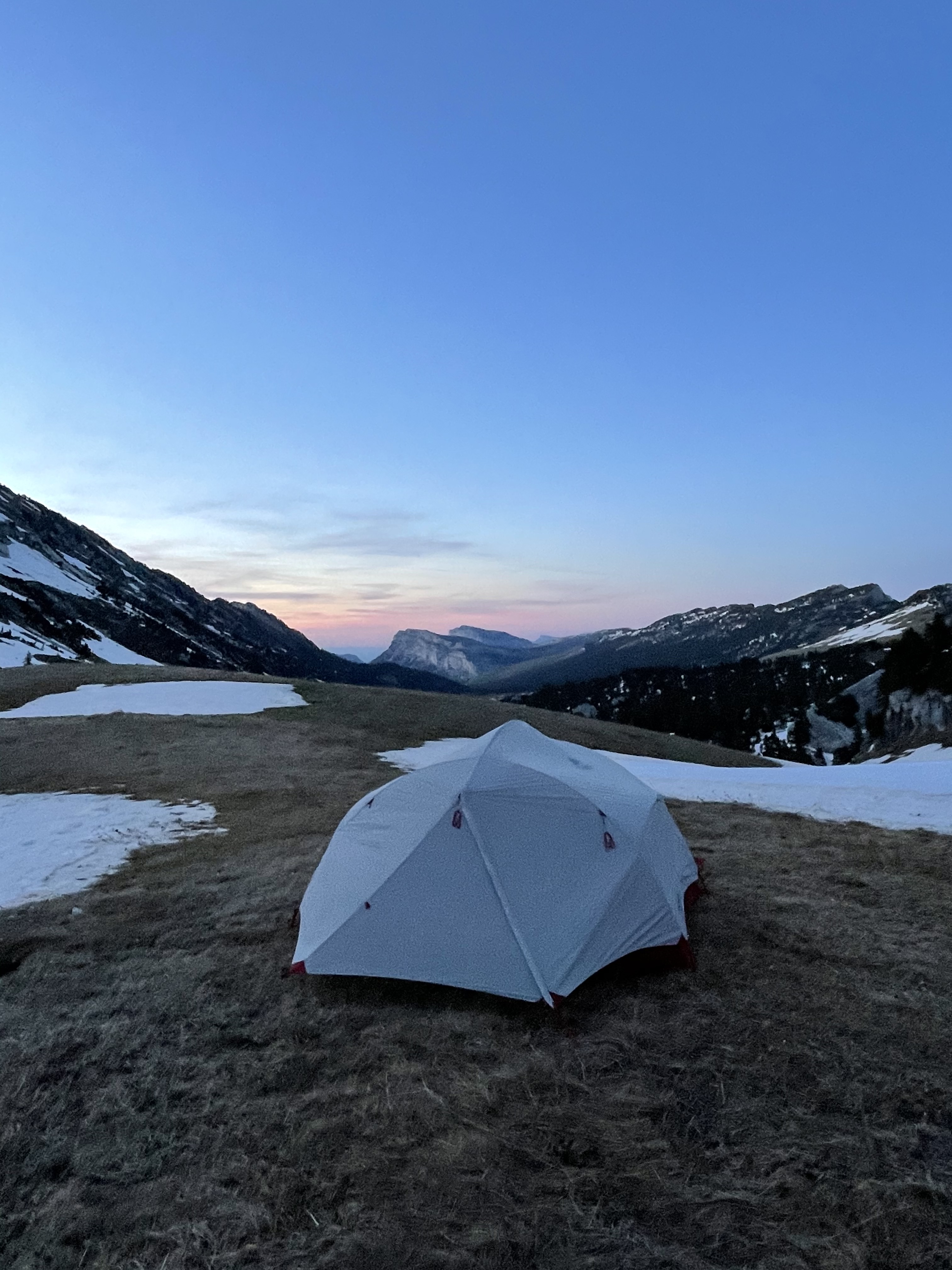 En bas, nous préférons arrêter notre journée à cet endroit, où nous trouvons des zones herbeuses sans neige. Nous installons notre campement avant la tombée de la nuit et rechargeons les batteries avec un bon plat de pâtes ! Nous profitons du coucher de soleil. La nuit est très agitée, et le vent souffle fort, une baleine de notre tente n’y résistera pas.
