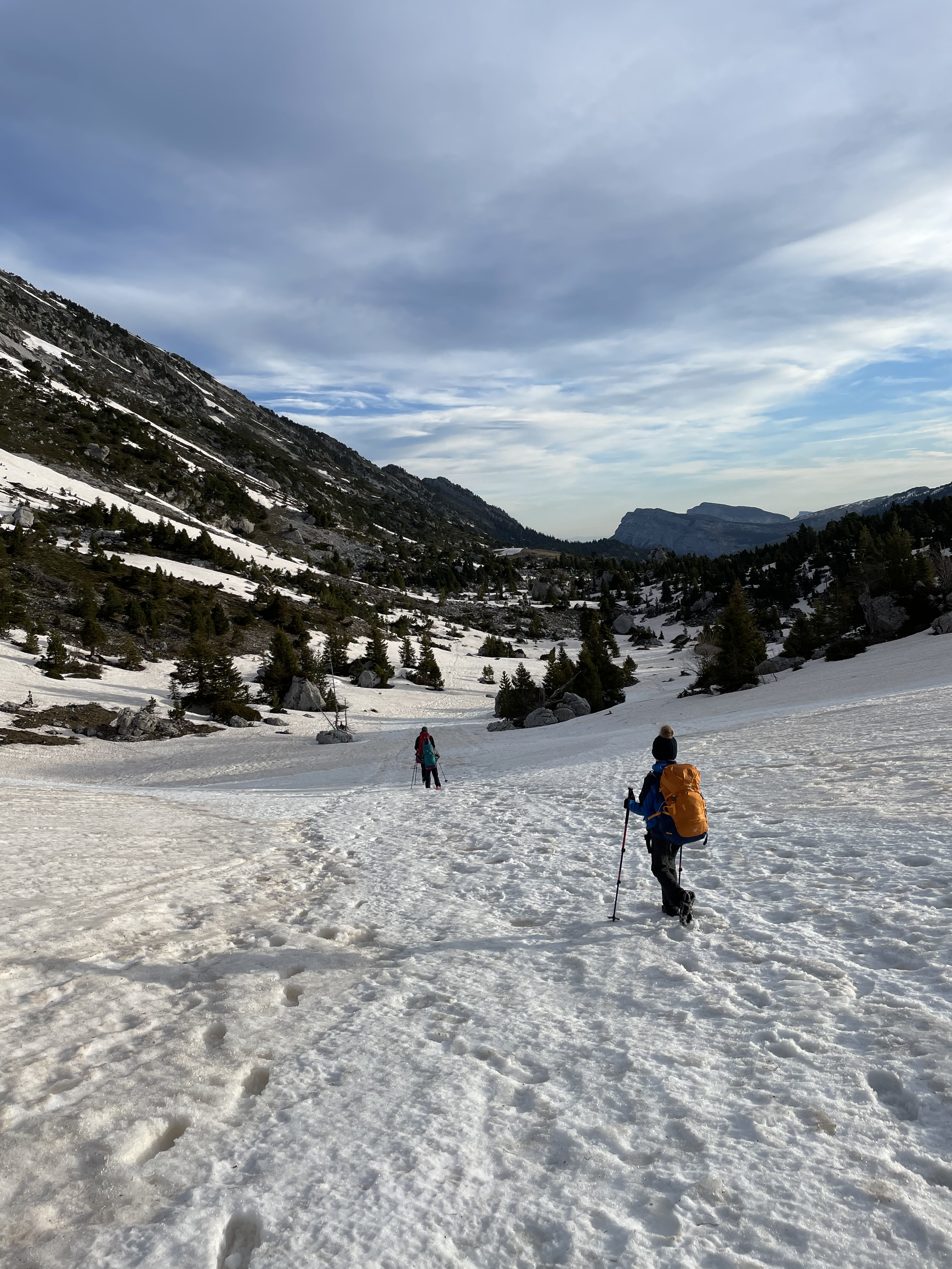 Il n’est que 7h15 et nous sommes déjà en route ! Nous parcourons les alpages de l’Aup du Seuil et le vallon de Marcieu. La lumière est douce, la neige est omniprésente. Nous sommes vigilants à bien suivre la trace GPS du sentier, grâce à notre téléphone mobile et notre application Outdooractive. En effet, avec la neige il est impossible de suivre précisément le sentier, les marques hors de la neige sont insuffisantes.