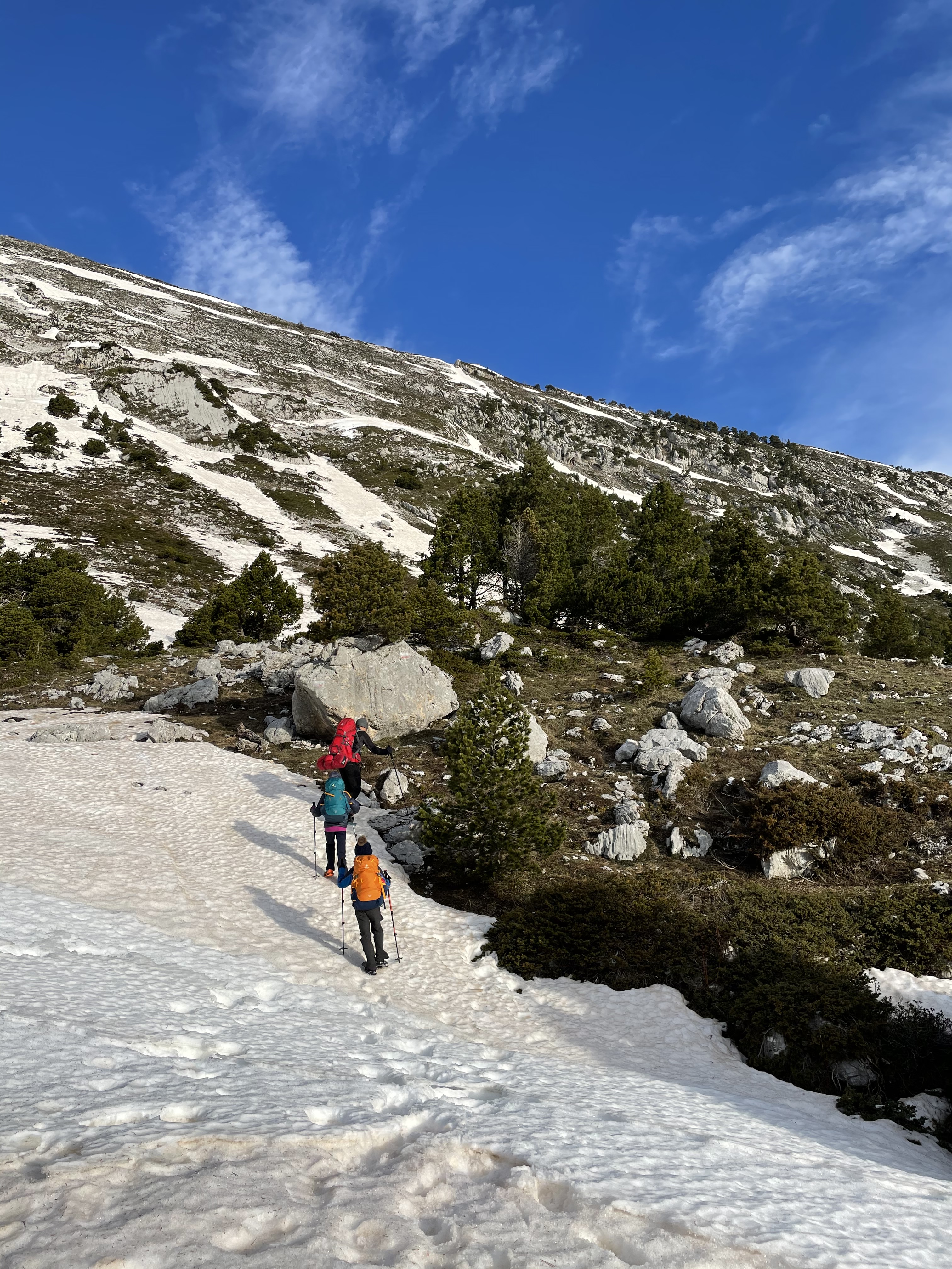 Nous voilà partis pour cet itinéraire. Nous prévoyons nos petits crampons au cas où nous rencontrerions encore un peu de neige dans les versants Nord comme cela nous a été indiqué. On laisse évidemment Agatha chez ses cousins car l’itinéraire est trop ambitieux pour notre mini-marcheuse. Nous sommes 4, avec Olivia 12 ans et Timothée 11 ans.