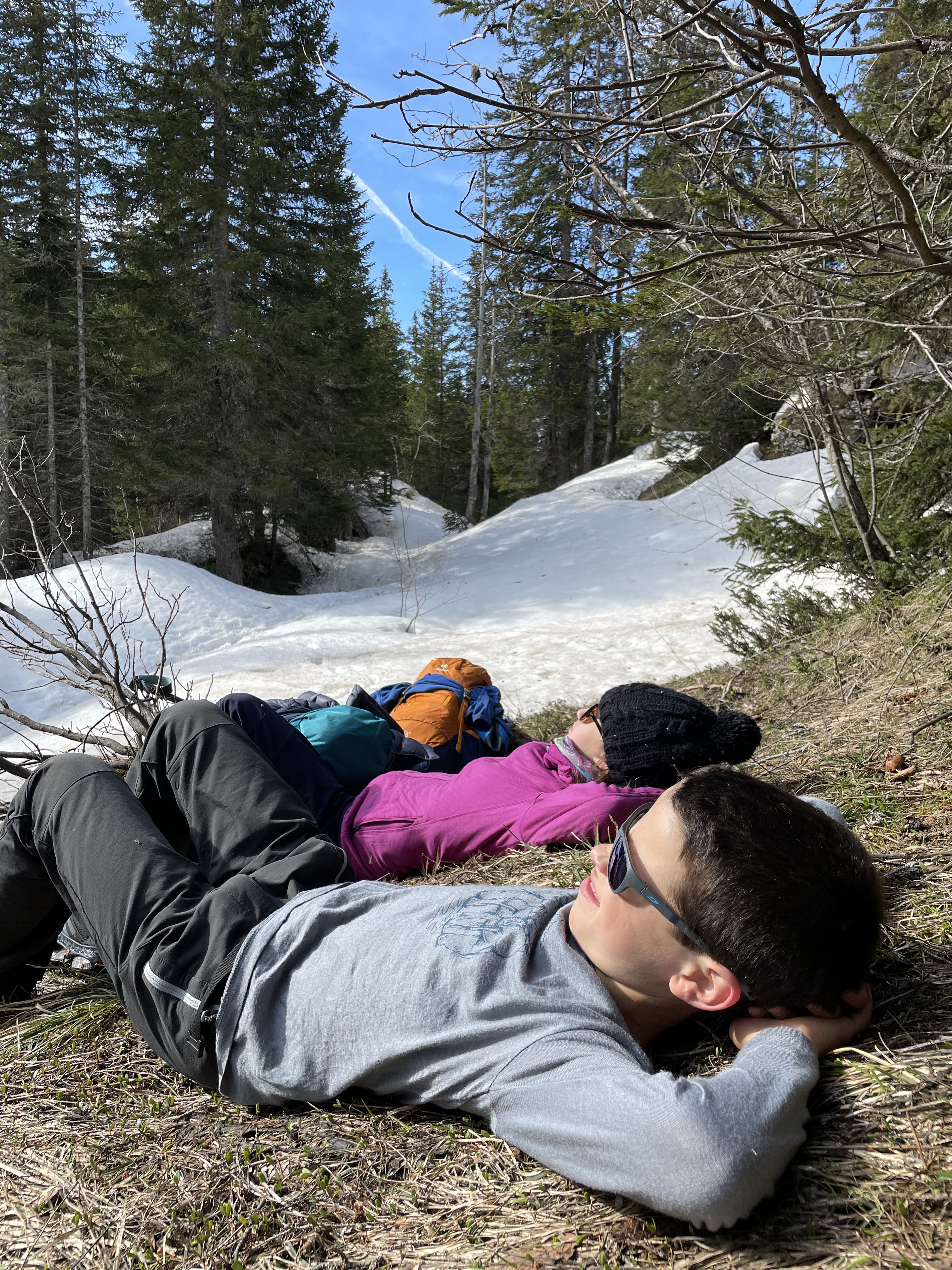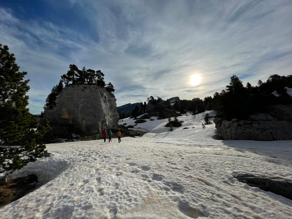 Après le vallon de Marcieu, nous traversons la forêt de l’Aulp du Seuil où l’enneigement est encore important. Puis nous arrivons au Habert de la Dame. Nous pouvons apercevoir tout au loin le col de Bellefont ! C’est très impressionnant de se dire que l’on a déjà parcouru tout ce chemin à pied ! Les enfants sont très fiers.