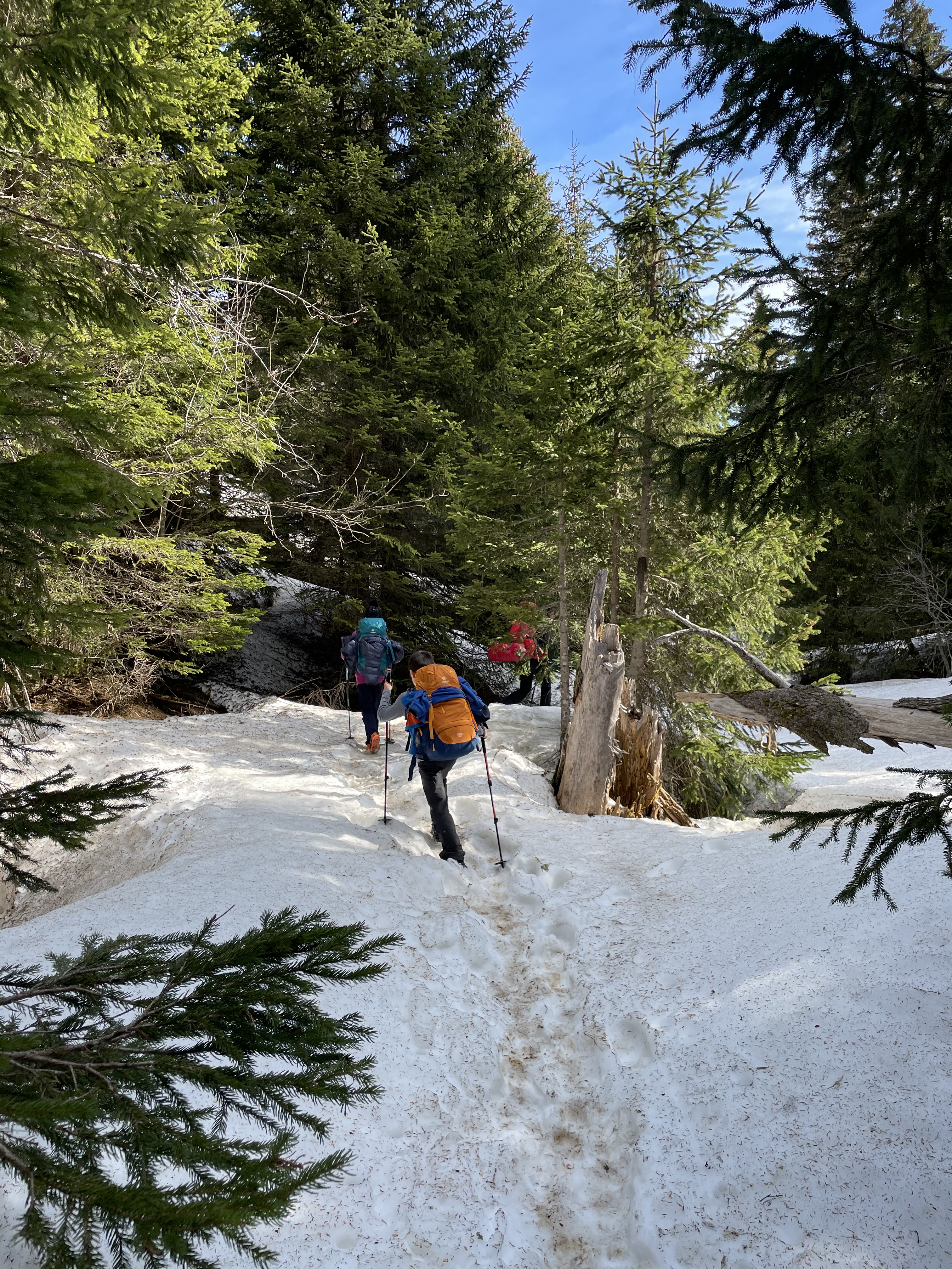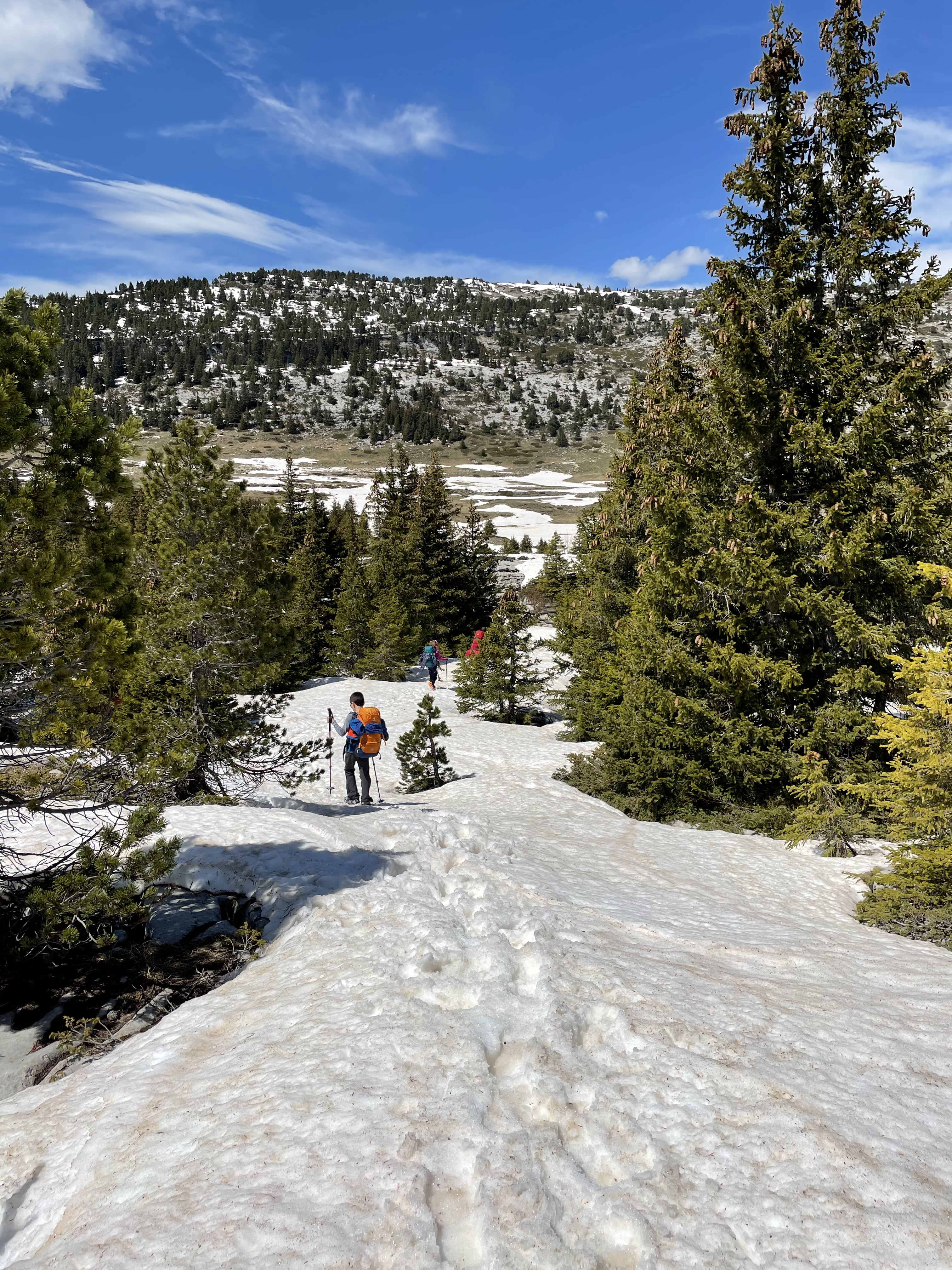 Nous poursuivons notre chemin à travers des lapiaz et des pentes boisées. La présence de scialets (puits dans les lapiaz) dissimulés sous la neige demande beaucoup de vigilance.