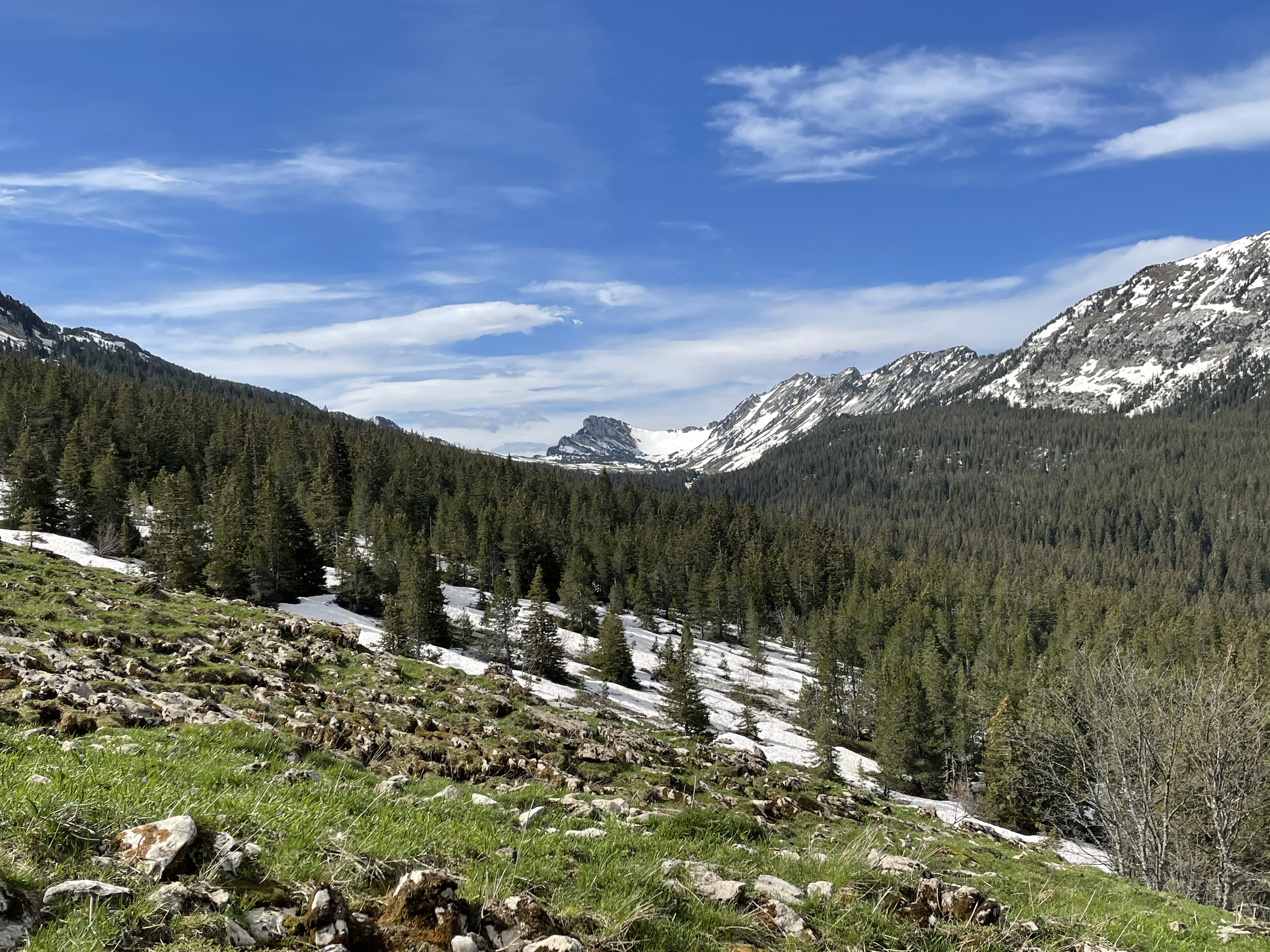 A l’arrivée en haut du Col, nous constatons qu’il y a encore beaucouuuup de neige de l’autre côté et que le vallon est déjà tout à l’ombre. La vue depuis le col de Bellefont dévoile tout le plateau de l’Aulp du Seuil. Il est difficile de trouver le sentier sous la neige et la pente est telle que la seule solution est de descendre sur les fesses. Et même avec cette technique, nous dévalons la pente à toute vitesse !!