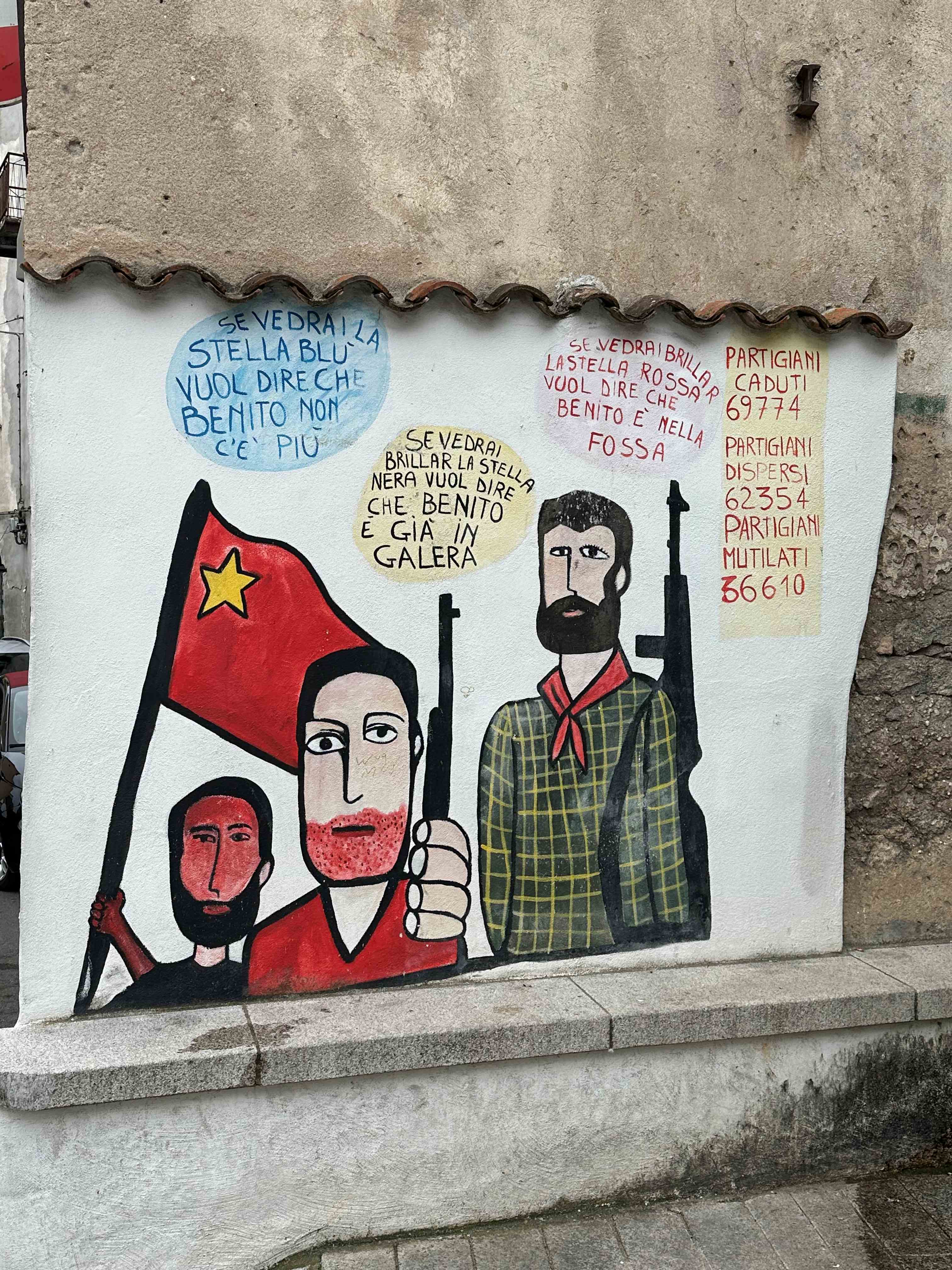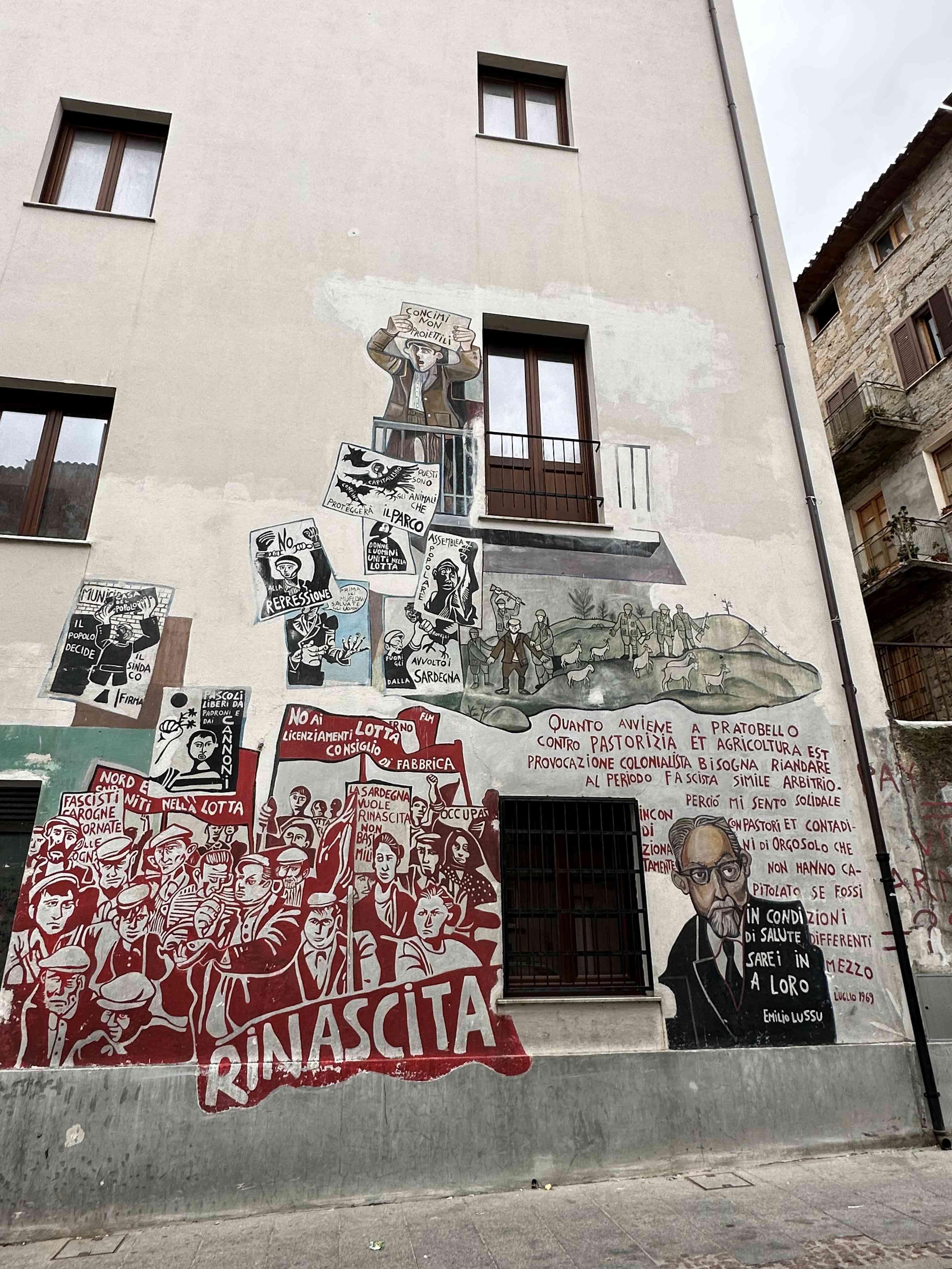 Le village d’Orgosolo se trouve dans le centre de la Sardaigne, non loin de Dorgali et des Cala Fuili et Cala Luna. Ce village, à l’image de rebelle, était réputé pour abriter des bandits et hors-la-loi. Dans les années 70 pour s’opposer à un projet de camp militaire, les habitants ont pris les pinceaux pour militer contre le projet. La tradition est restée et on retrouve dans le village tout au fil des ruelles et places des peintures de toutes sortes politiques ou militantes.